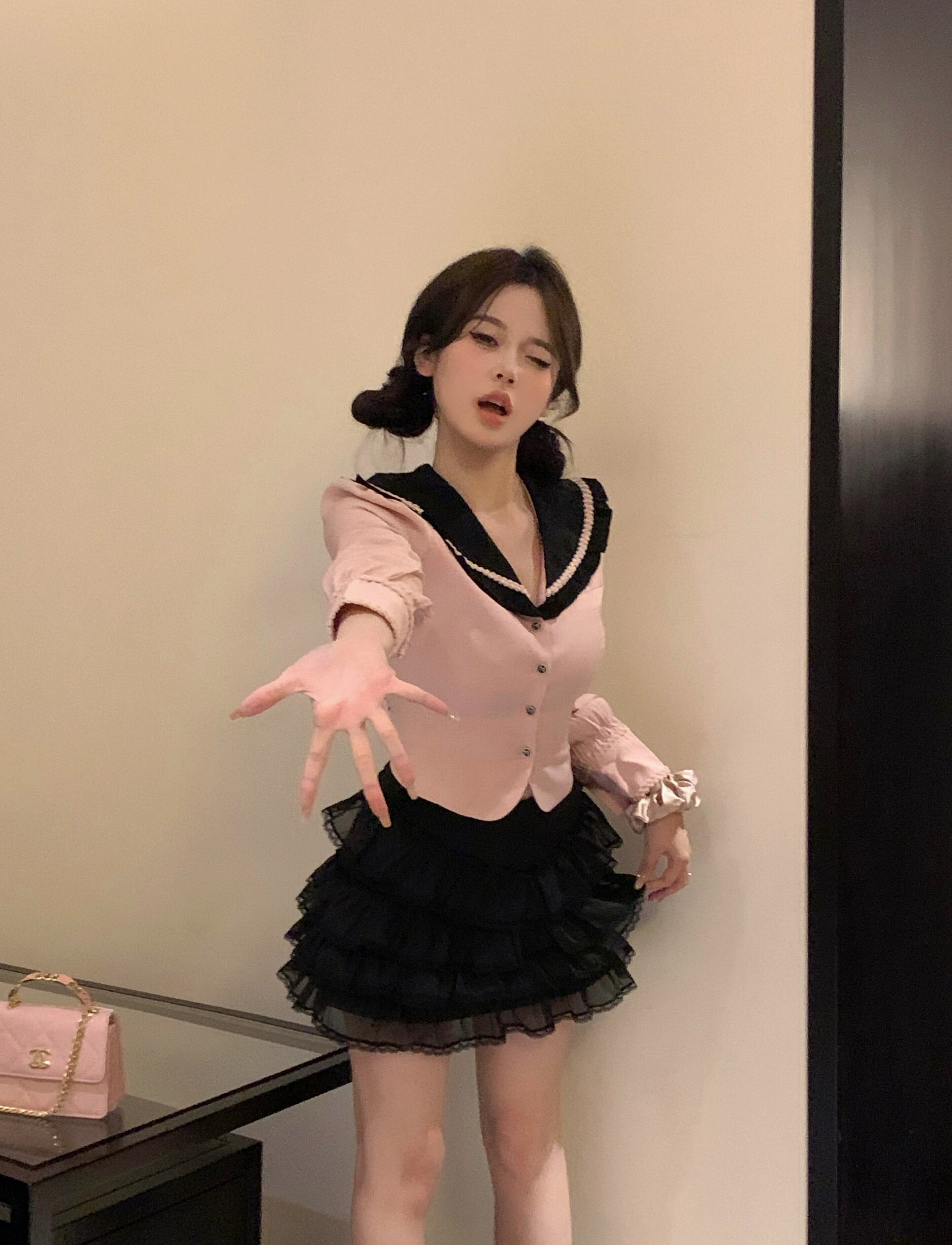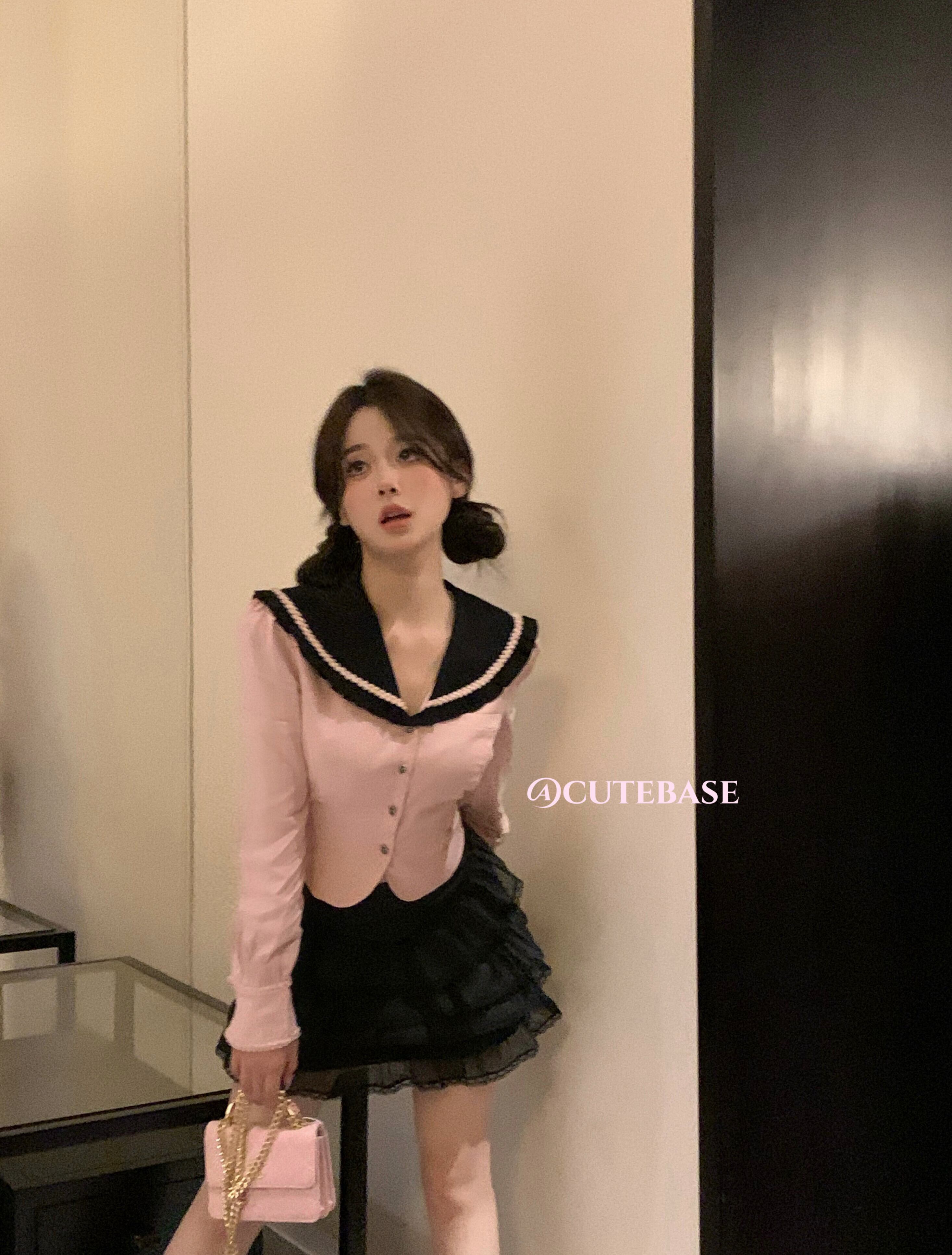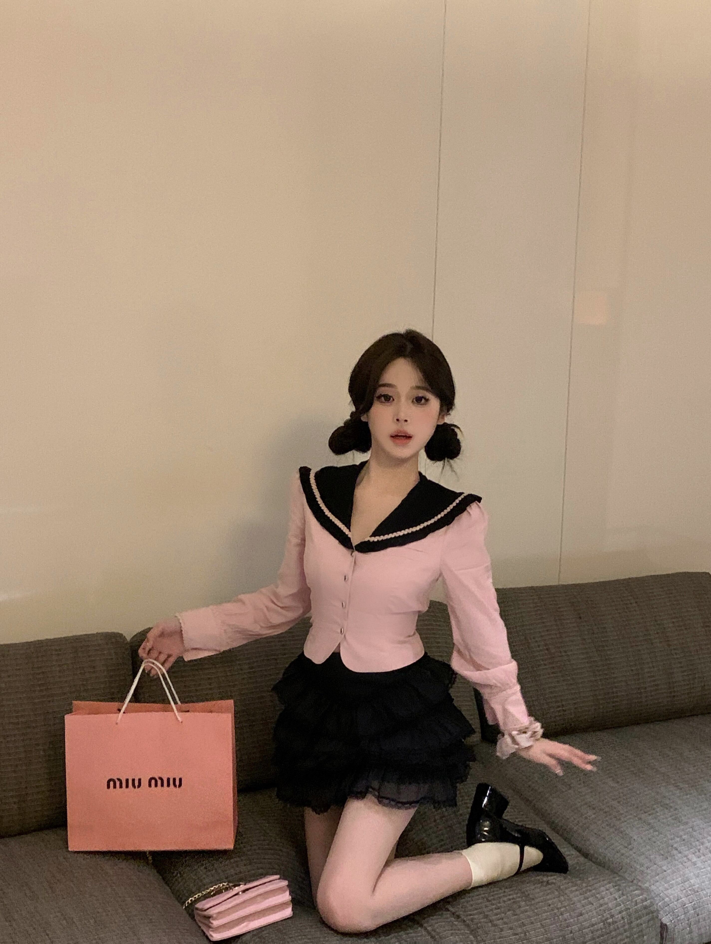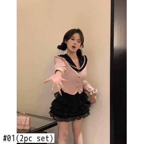 ホットガールスーツターンダウン襟長袖シャツ夏黒ウエストミニスカート 2 点セット服 ロング ブラック サマー 夏物