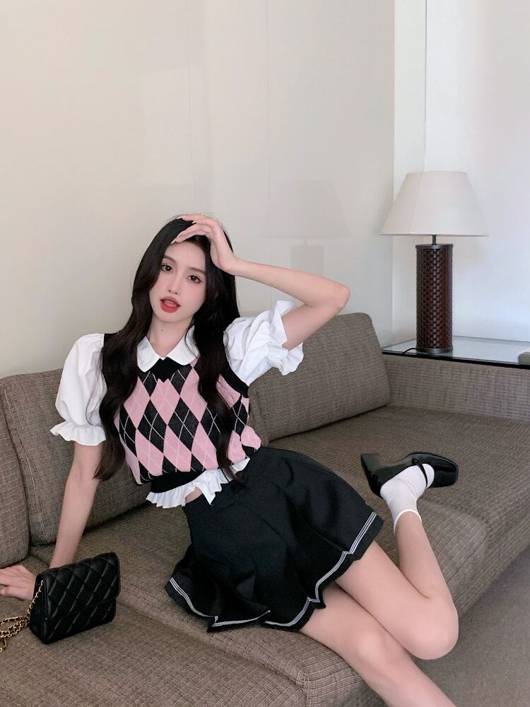 Gothiscyn パフスリーブシャツ + ニットベスト + プリーツスカートセット甘いスリムシャツ夏 Y2k スーツ 大人ガーリー スウィート キュート カジュアル サマー 夏物