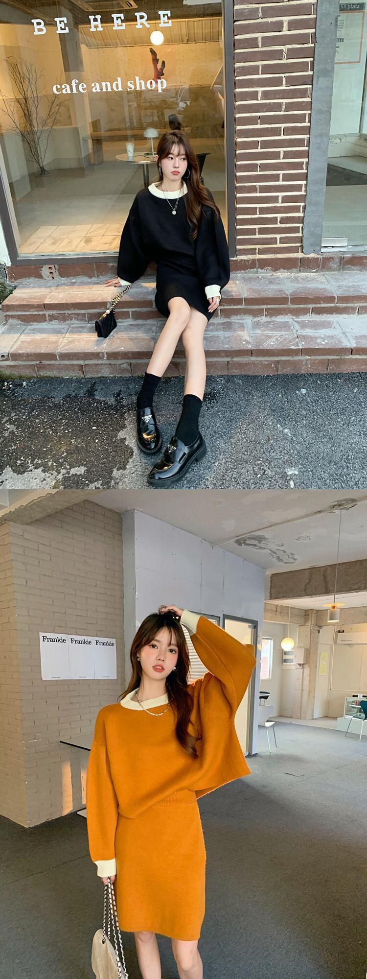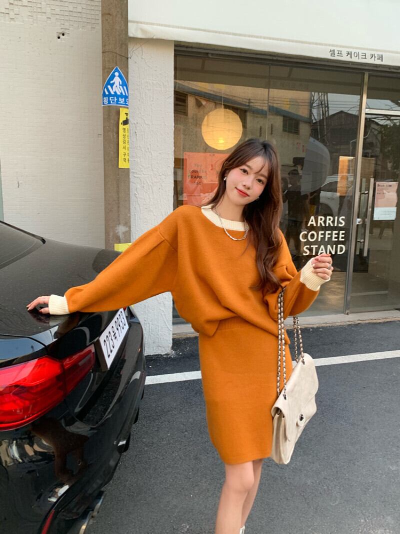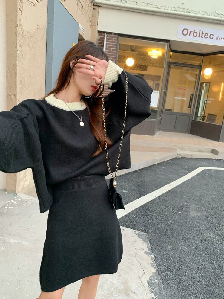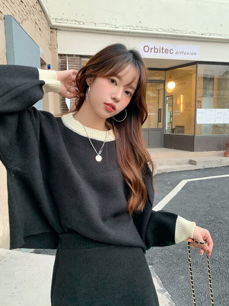 スタイルスーツレディース秋冬コントラストラウンドネックニットトップウエストスカート2点セット オータム 秋物 ウィンター 冬物 Oネック