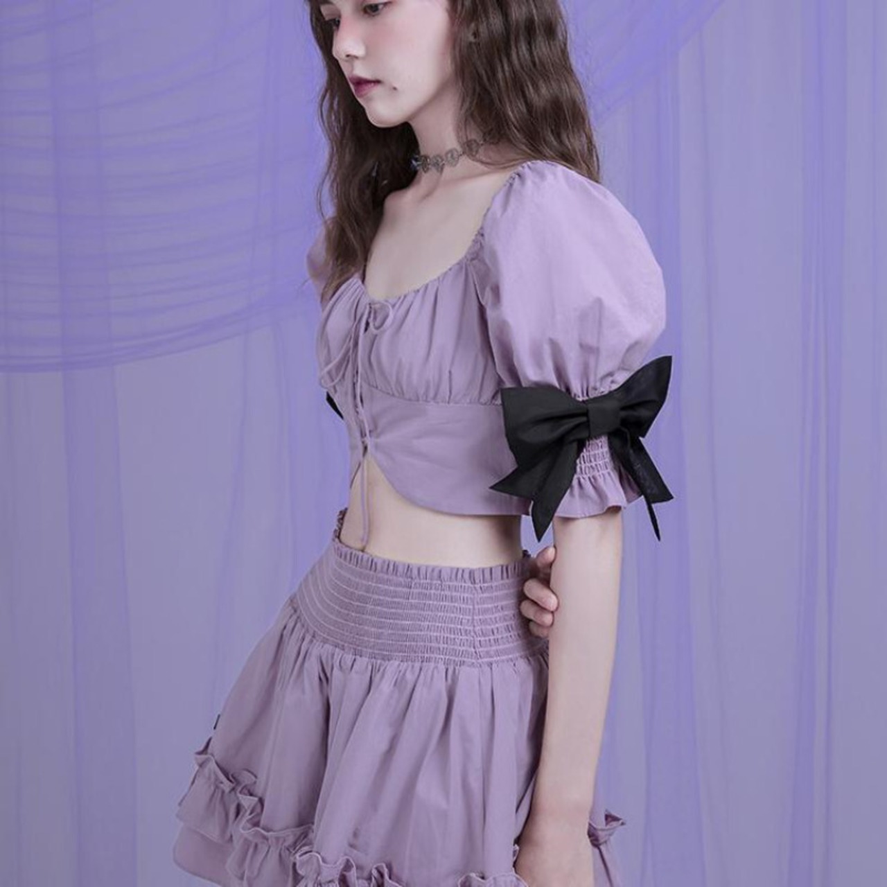 スタイル甘いクールスーツ夏 V ネック ランタン スリーブ ショート トップ ウエスト A ライン プリーツ スカート 2 点セット ランタンスリーブ 大人ガーリー スウィート キュート カジュアル サマー 夏物 Vネック Aライン