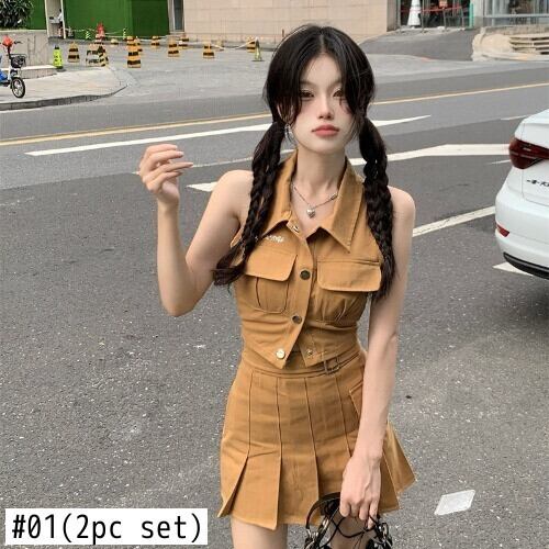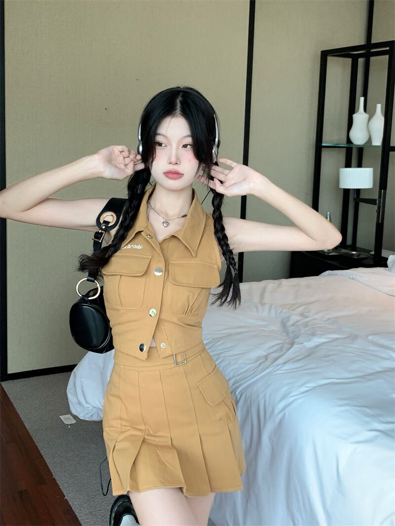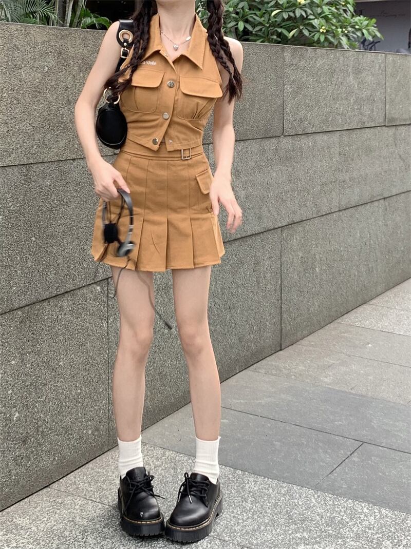 ホットガールズスーツ夏ノースリーブレトロターンダウンショートトップ + プリーツ A ラインスカート 2 点セット服 サマー 夏物 Aライン
