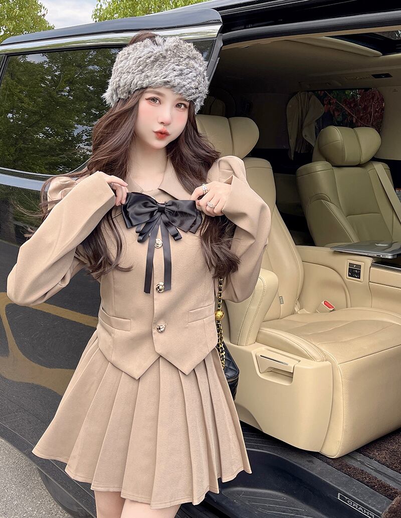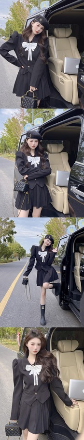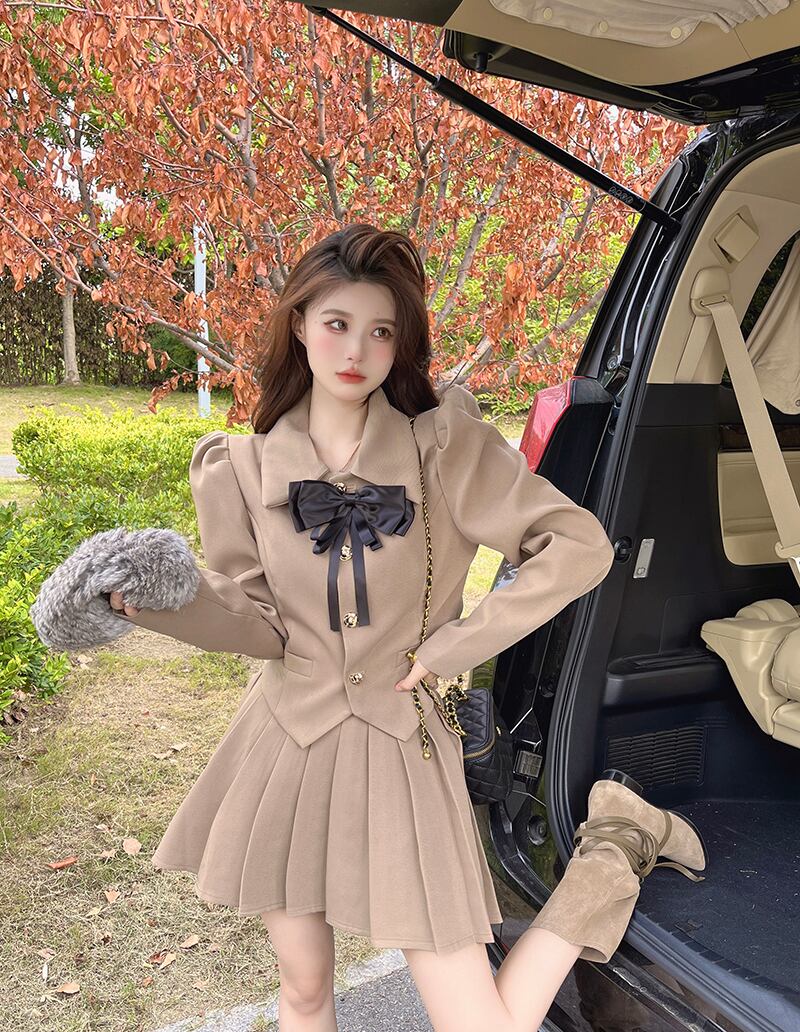 スウィートガールスーツボウノットバブルスリーブスーツジャケット秋ホットガールプリーツスカートツーピースセット服 リボン 大人ガーリー キュート カジュアル オータム 秋物