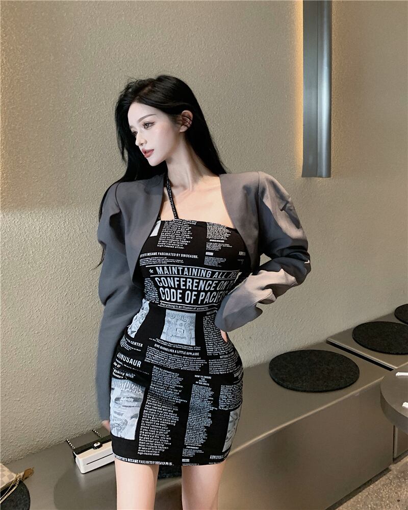 フレンチクールスタイルバブルスリーブショートスーツコートプリントスリムスパゲッティストラップドレスツーピースセット服