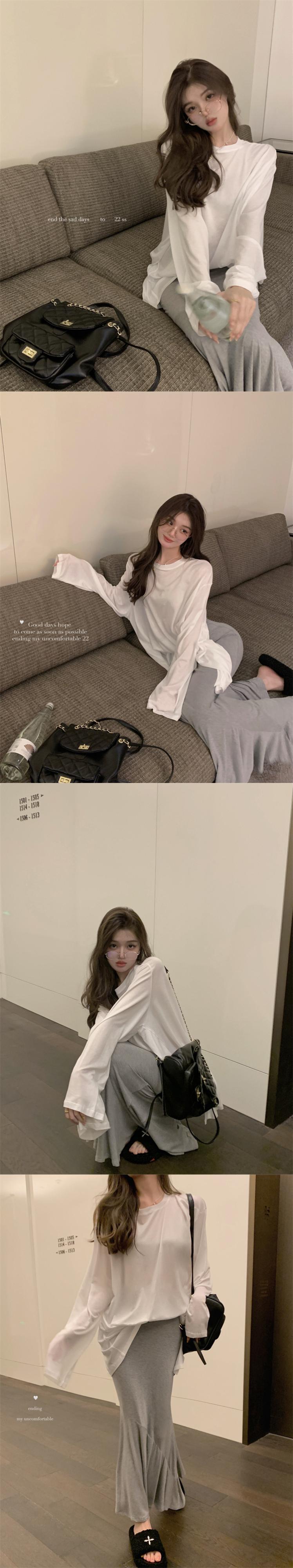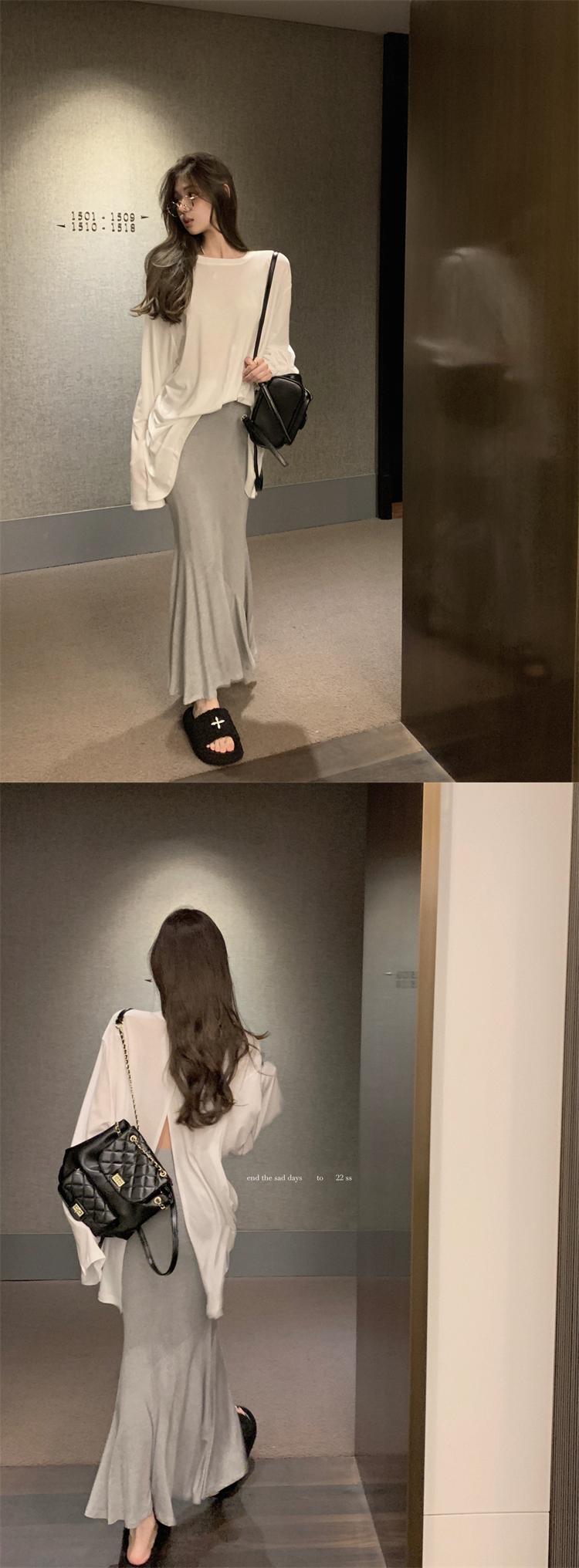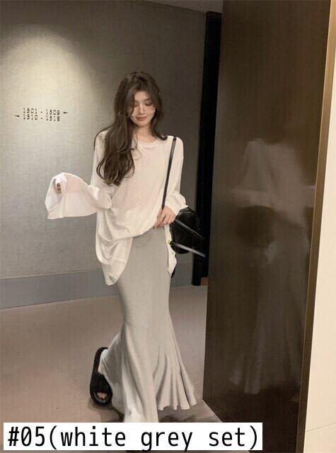 ツーピースセットレディース衣装スプリットバックルーズ長袖日焼け止め Tシャツウエストラップヒップフィッシュテールスカートセット ロング