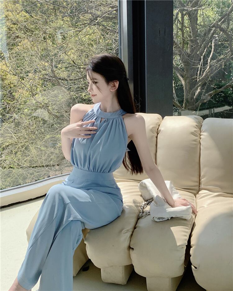 オフィスレディハンギングネックオフショルダーラウンドネックジャンプスーツノースリーブウエストスリムフィットワイドレッグジャンプスーツパンツ Oネック ワイドパンツ 会社 学校 通勤や通学にも