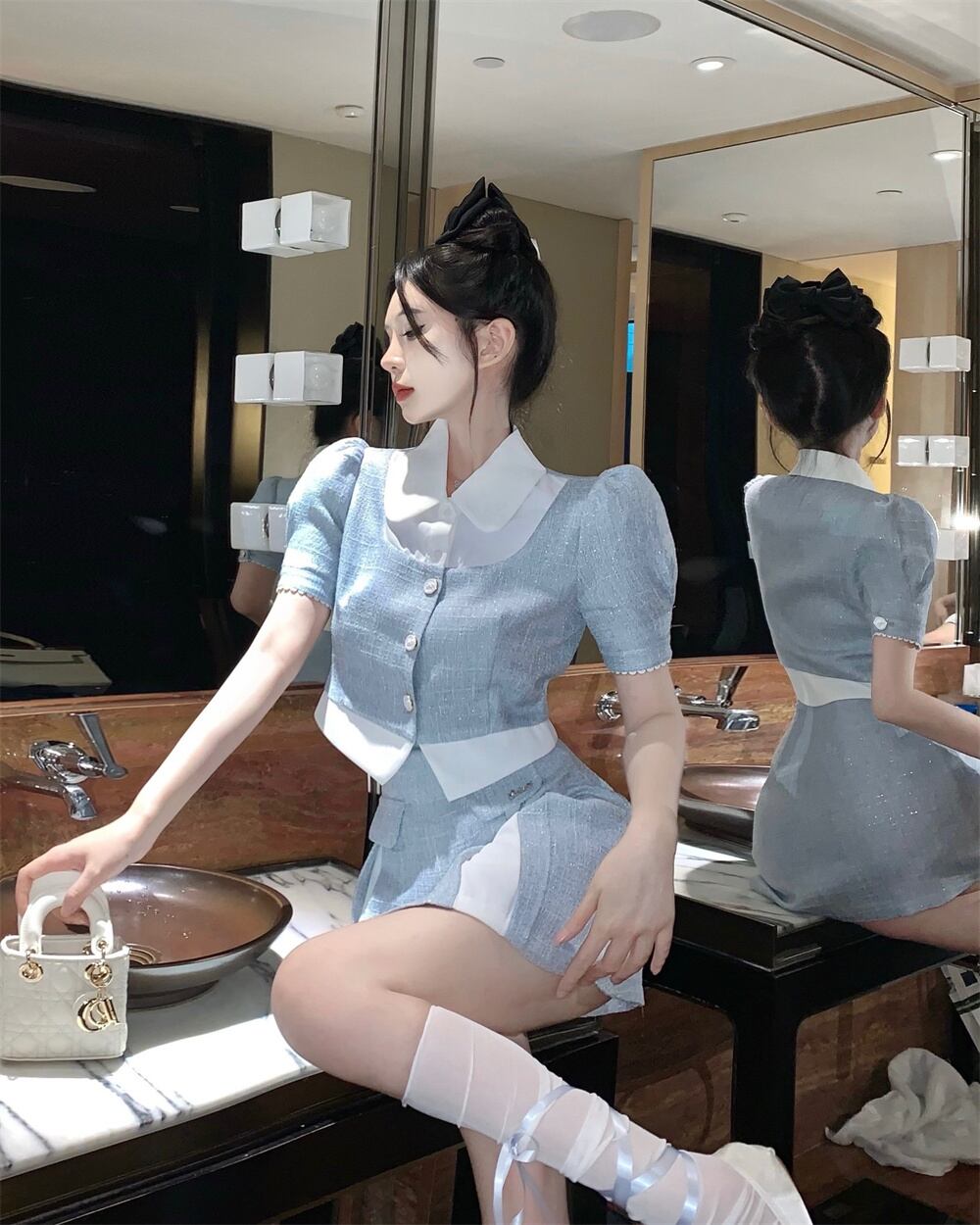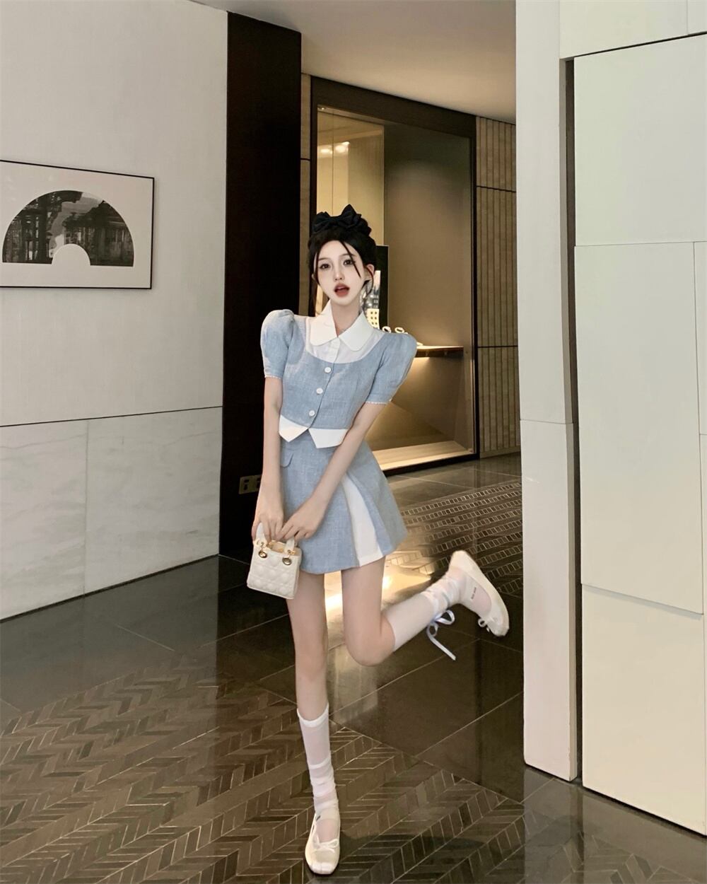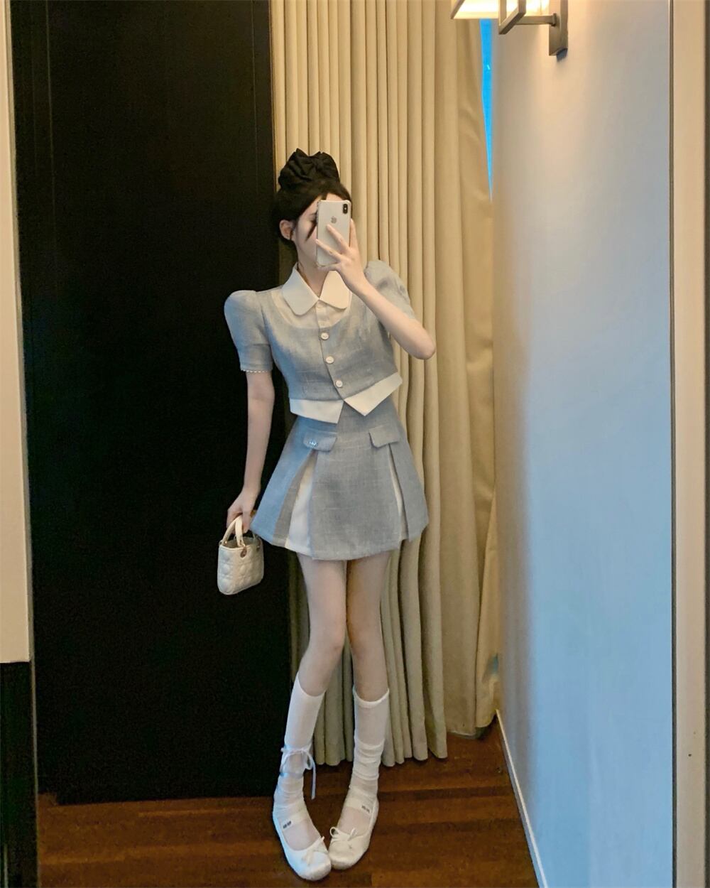 スウィートガールフレンチスタイルスーツピーターパン襟ショートコートウエスト A ラインスカート 2 点セット服 大人ガーリー キュート カジュアル Aライン
