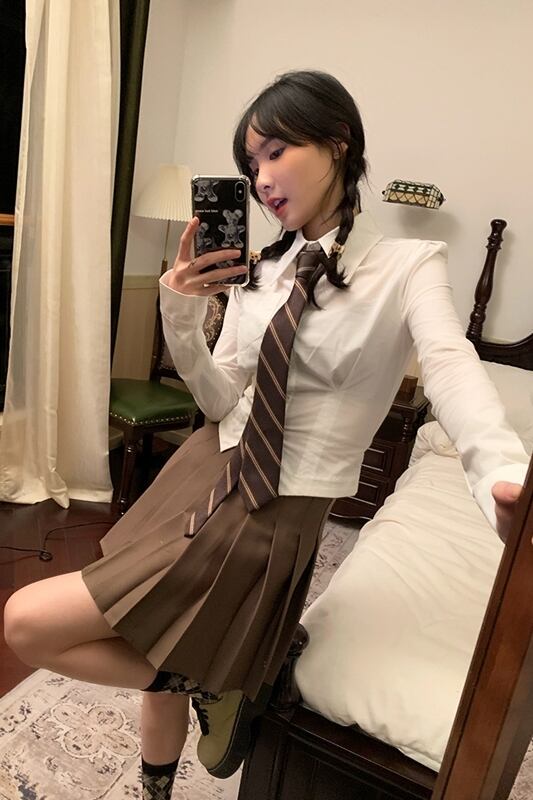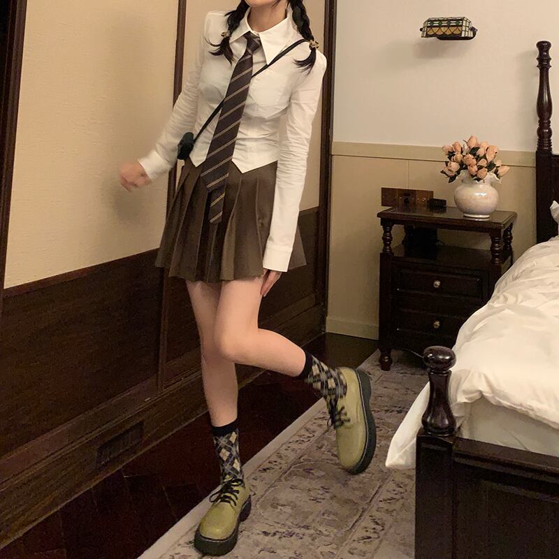 スカートセット秋スリム純粋欲望スタイル白長袖シャツ + コーヒー色プリーツスカートスーツ ロング ホワイト オータム 秋物 ピュア