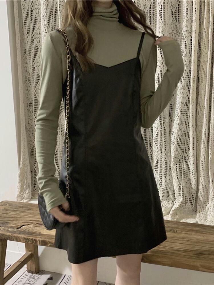 Gothiscyn ツーピーススーツ黒サスペンダーレザードレス Tシャツ長袖春夏ホットガールセクシー ロング ブラック スプリング 春物 サマー 夏物