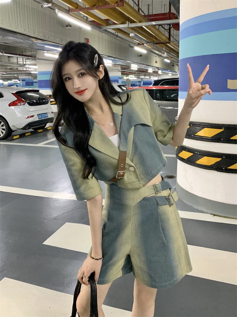 ホットガールデニムスーツ夏半袖シャツウエストワイドレッグショーツ 2 点セット服 サマー 夏物 ブルマー ワイドパンツ