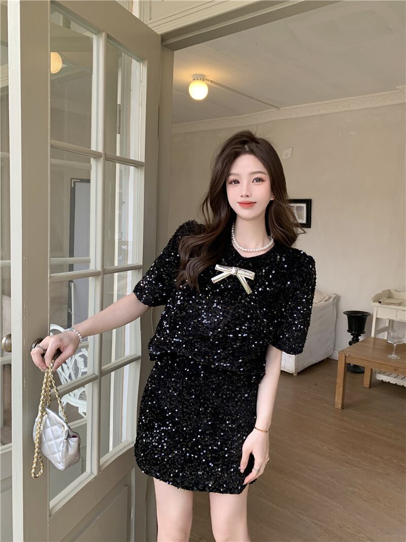 フレンチ スタイル オフィス レディ スーツ春ショート スパンコール トップ ウエスト スカート 2 点セット服 スプリング 春物 会社 学校 通勤や通学にも