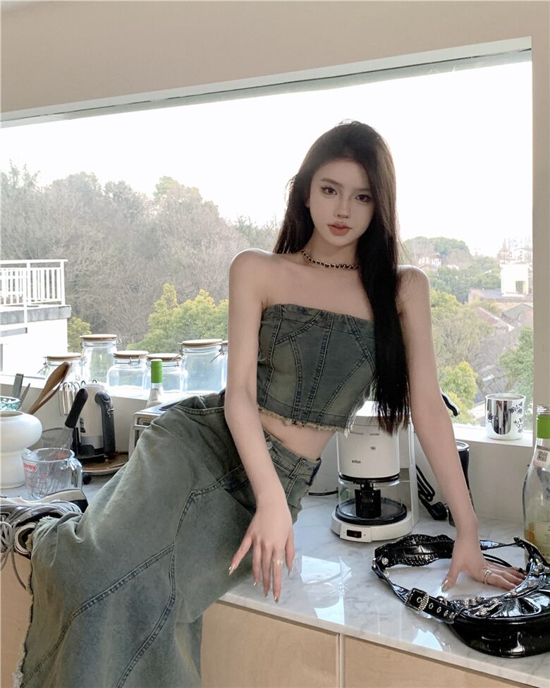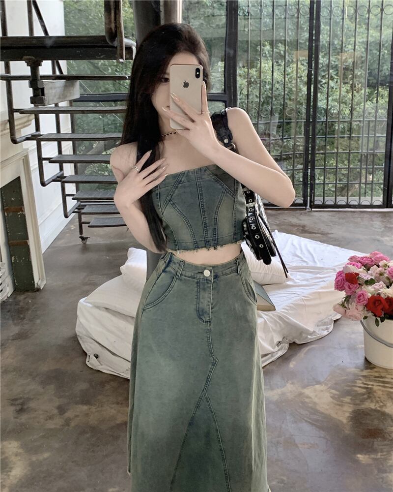 ホットガールズレトロスーツセクシーデニムストラップレスショートベストウエスト A ラインロングスカート 2 点セット服 Aライン