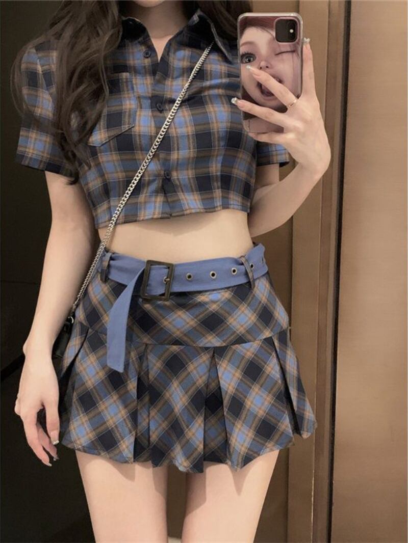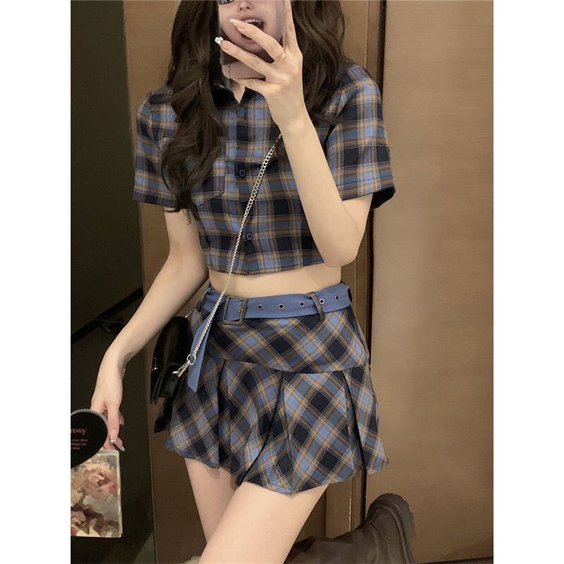 甘くてホット女子スタイルスーツ格子縞ショートシャツ夏トップウエストプリーツスカートツーピースセット服 大人ガーリー スウィート キュート カジュアル サマー 夏物