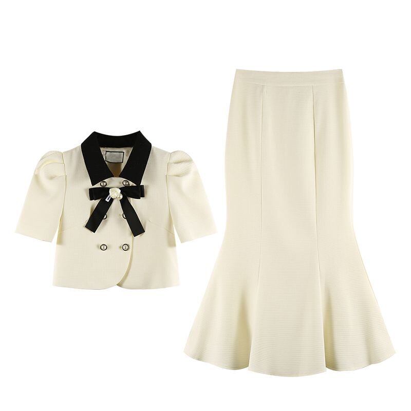 オフィスレディレトロスーツレディースサマーターンダウンカラーダブルブレストコートウエストマーメイドロングスカートツーピースセット 夏物 会社 学校 通勤や通学にも