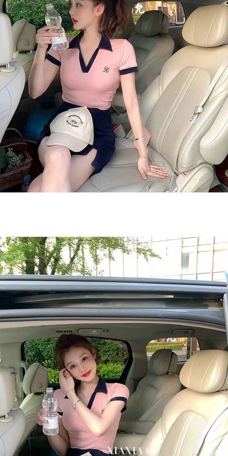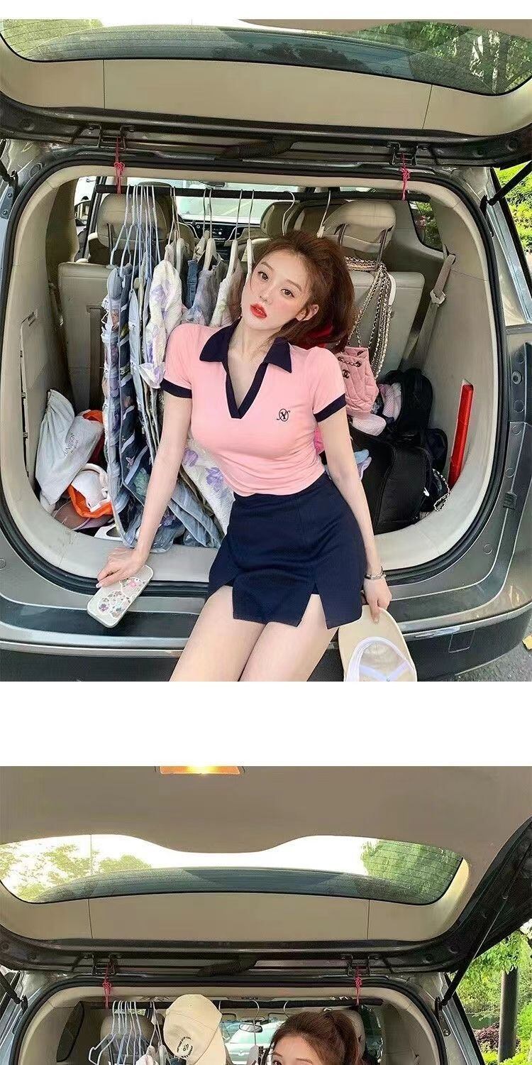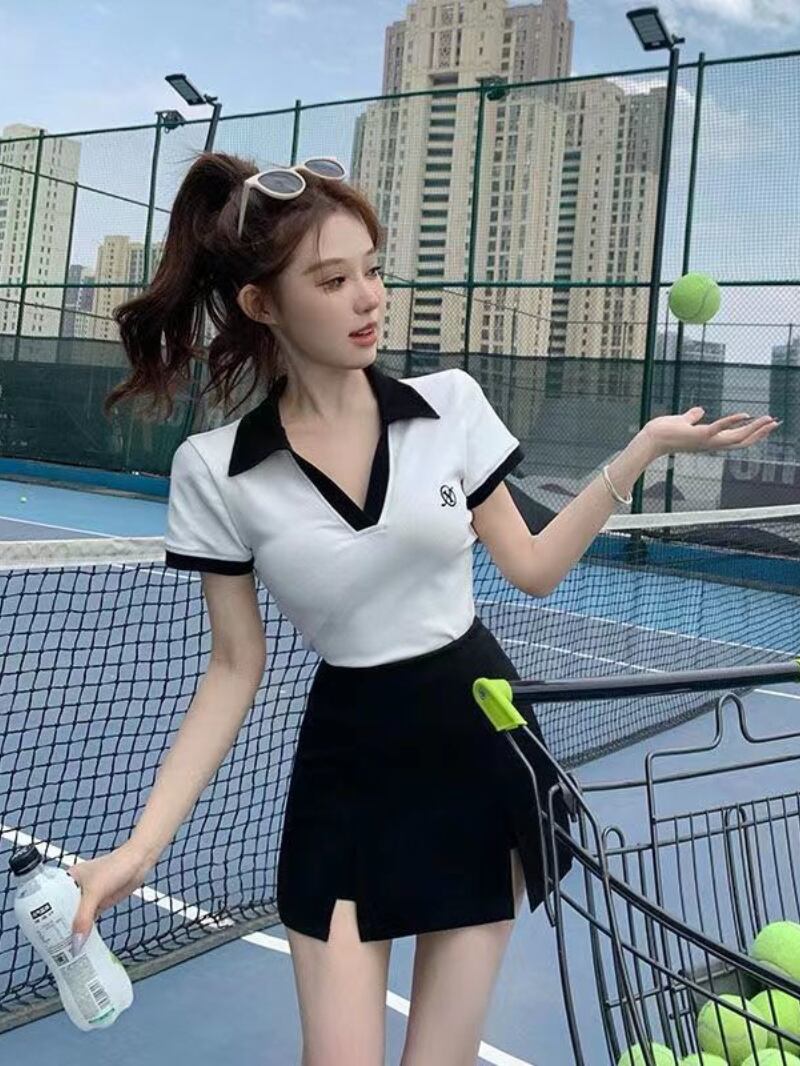ホットガールスポーツスーツターンダウンカラーカラーマッチング V ネックトップスプリットショーツ 2 点セット服 ブルマー Vネック
