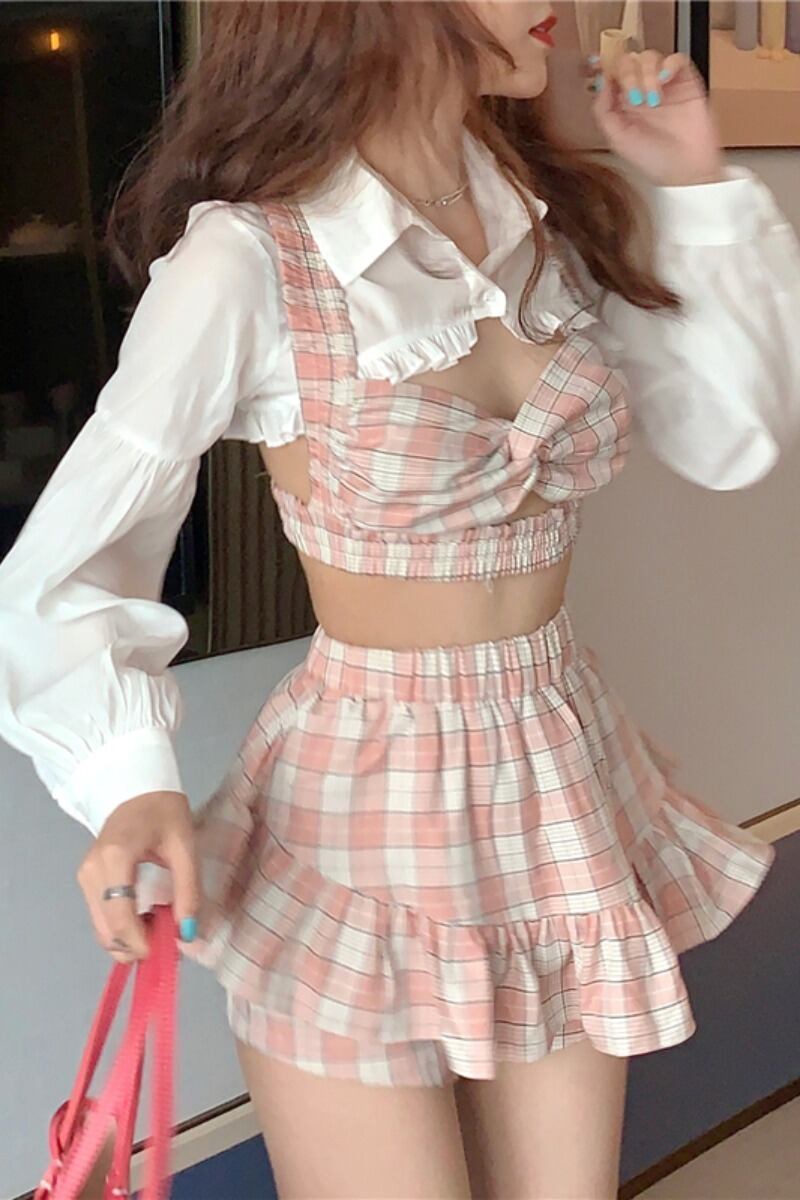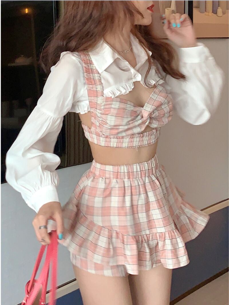 ホットガールスーツ弓チェック柄ストラップショートトップフリル a ラインスカートショーツ食用木菌長袖ショール 3 点セット ロング リボン ブルマー Aライン