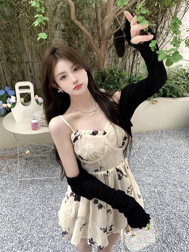 Gothiscyn ツーピース夏スーツ日焼け止めカーディガントップ花柄メッシュサスペンダードレス黒セクシーローブ Vestidos ブラック サマー 夏物