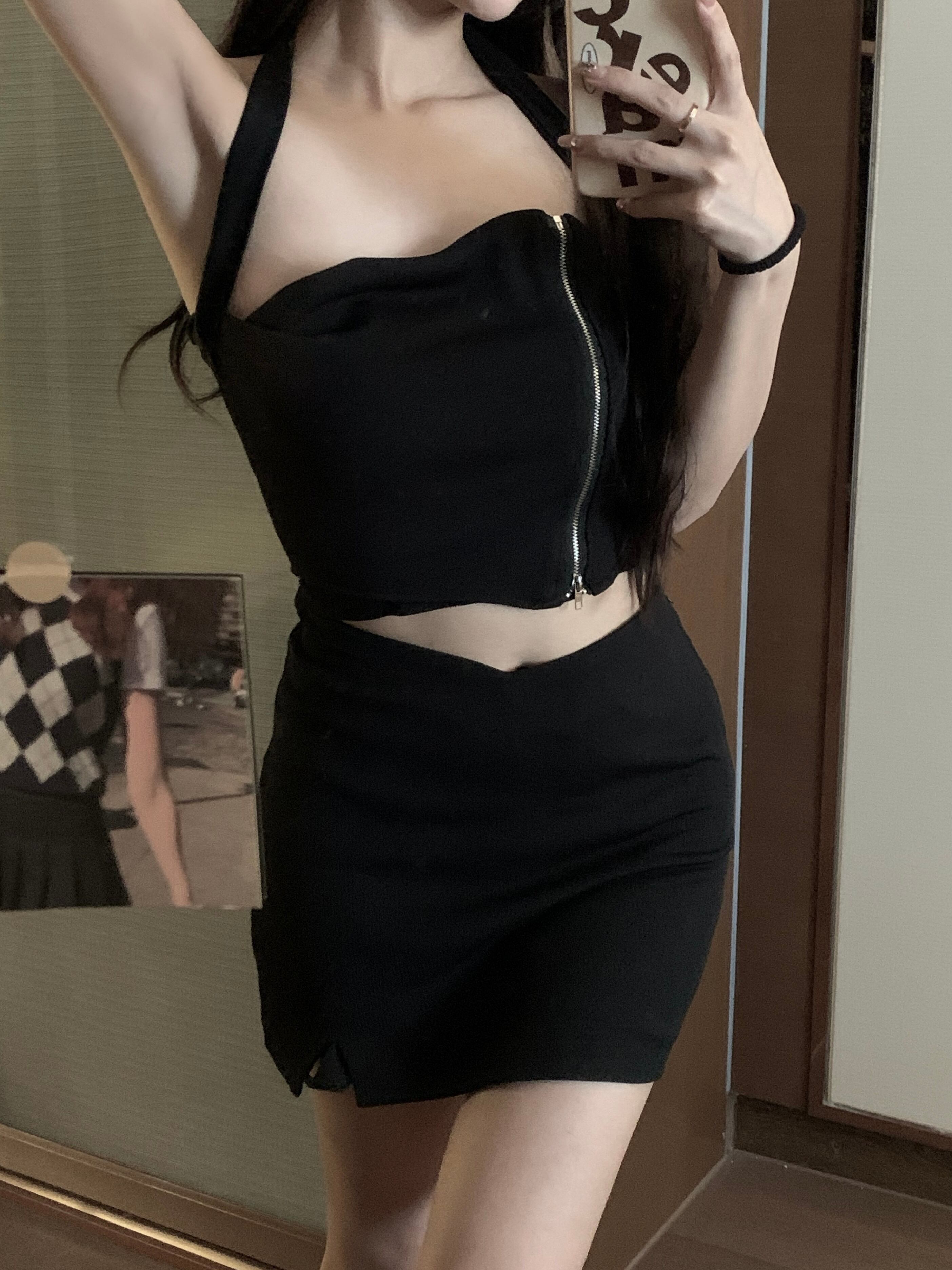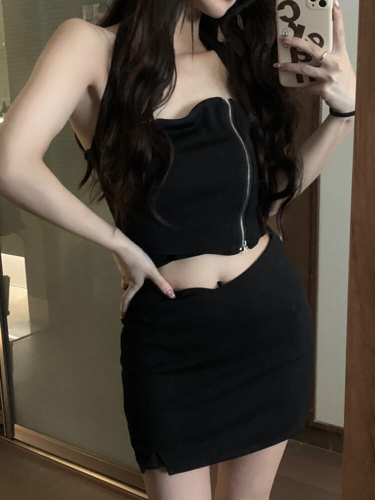 Gothiscyn Pure Desire ショート ワンショルダー ロングスリーブ トップ ホルター ベスト ジッパー A ライン スカート ホット ガール スーツ レディ シック Aライン ピュア