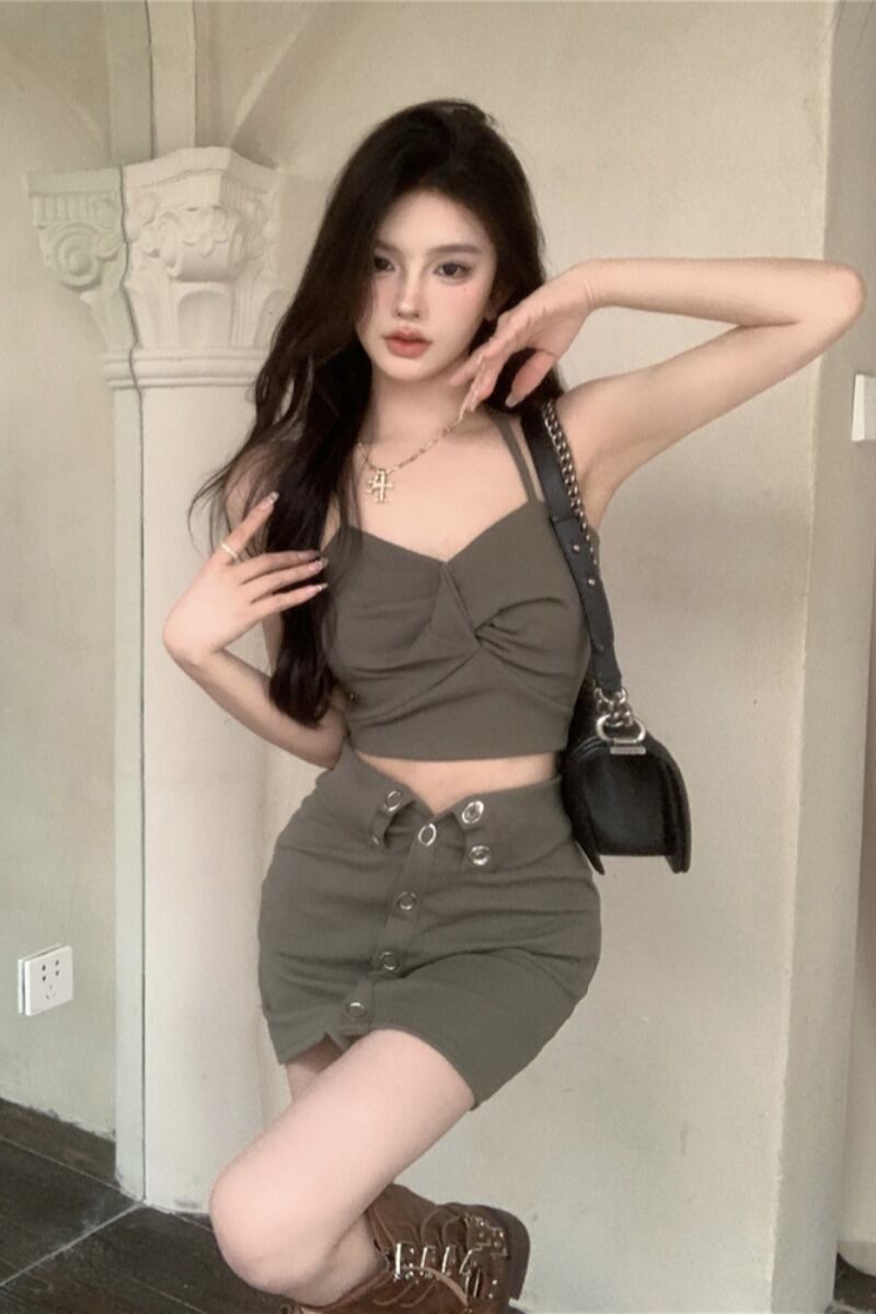 ホットガールスーツ純粋セクシースタイルストラップショートタンクトップウエストスリムラップヒップミニスカート 2 点セット服 ピュア