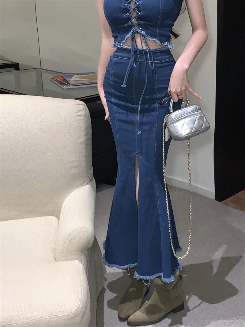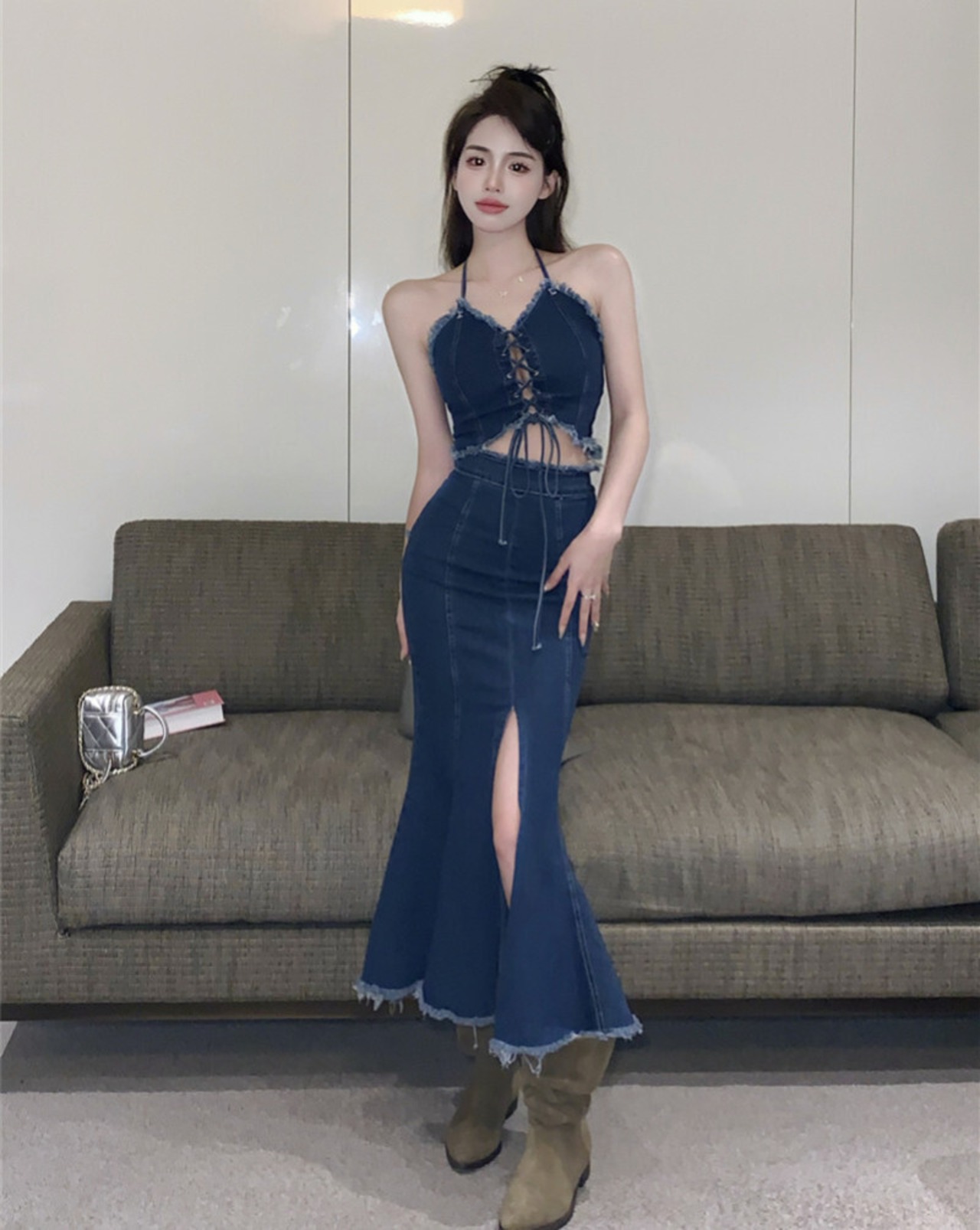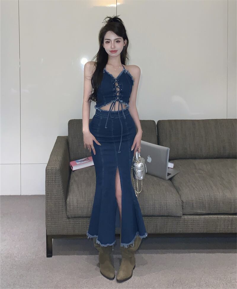 アメリカンデニムスーツショートサスペンダーベストスプリットマーメイドスカート甘いホットガールツーピースセット服 大人ガーリー スウィート キュート カジュアル