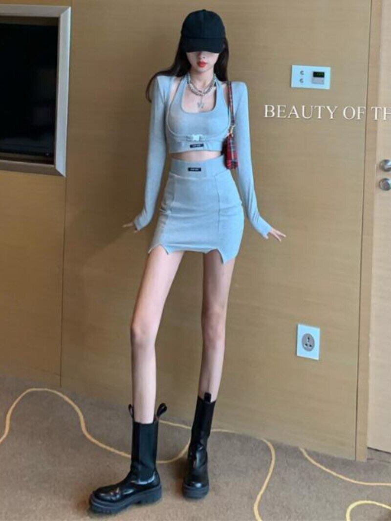 ホットガールスーツウエストショートスカート長袖コートホルターネックスリングトップ可能 3 点セット服 ロング