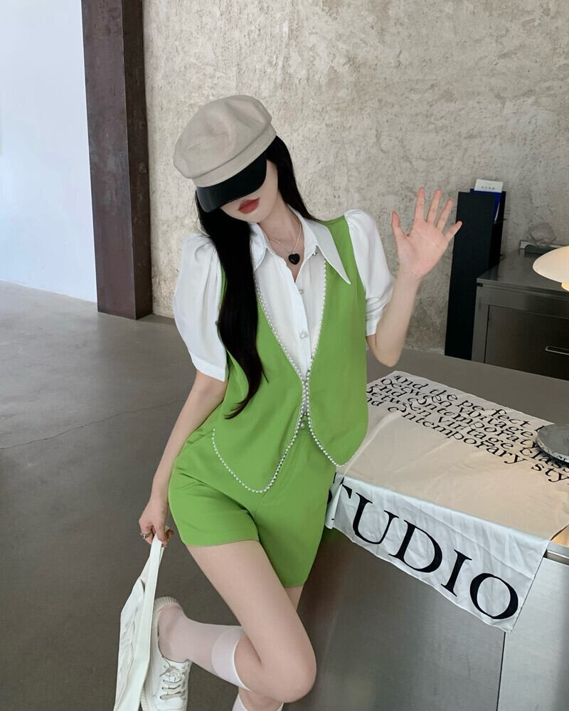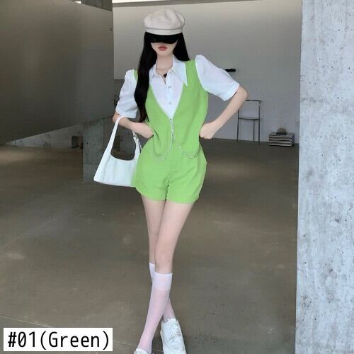 Sweet Girl スーツ レディース コントラスト ベスト フェイク 2ピース シャツ ウエスト ワイドレッグ ショーツ 2点セット 服 大人ガーリー スウィート キュート カジュアル ブルマー ワイドパンツ