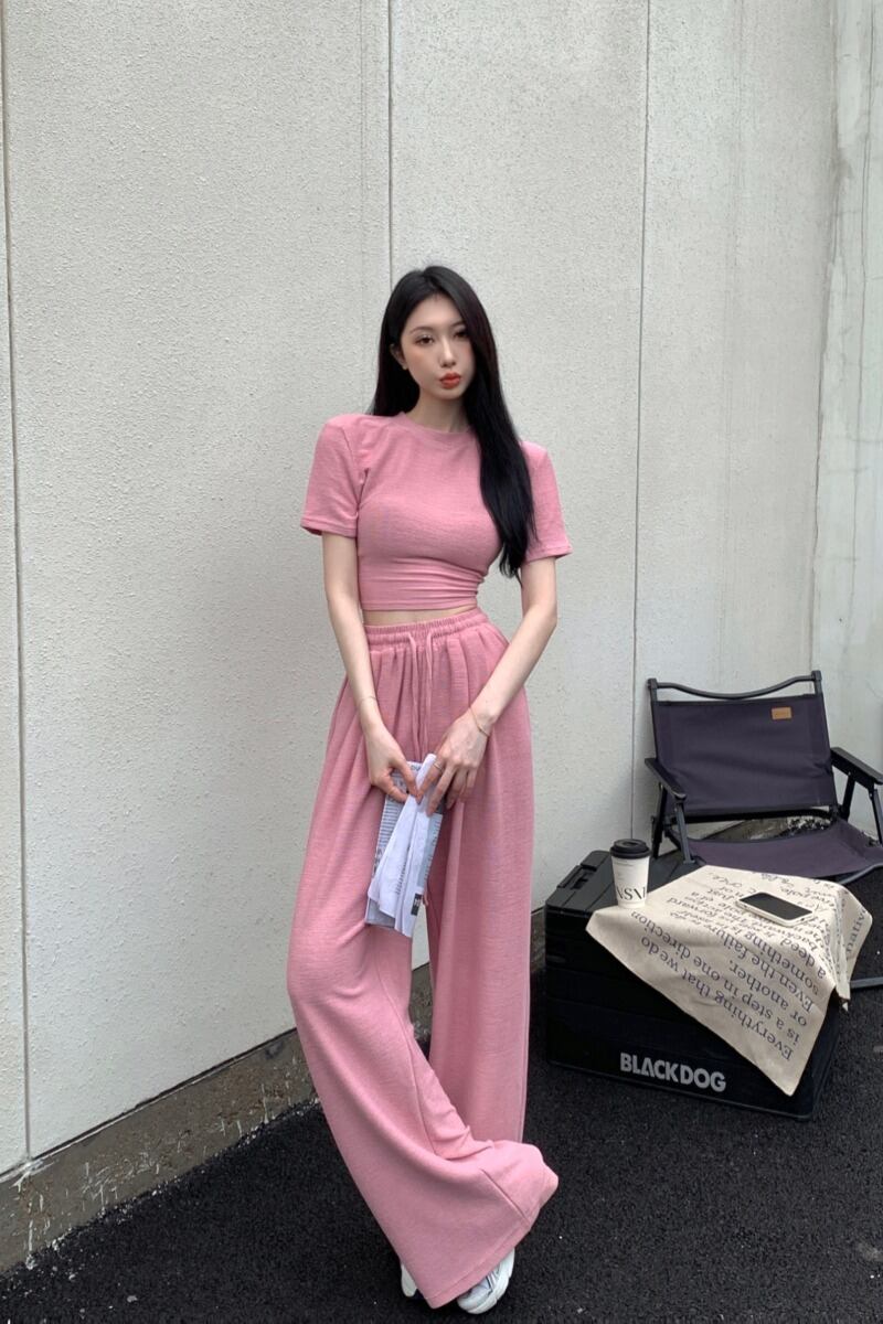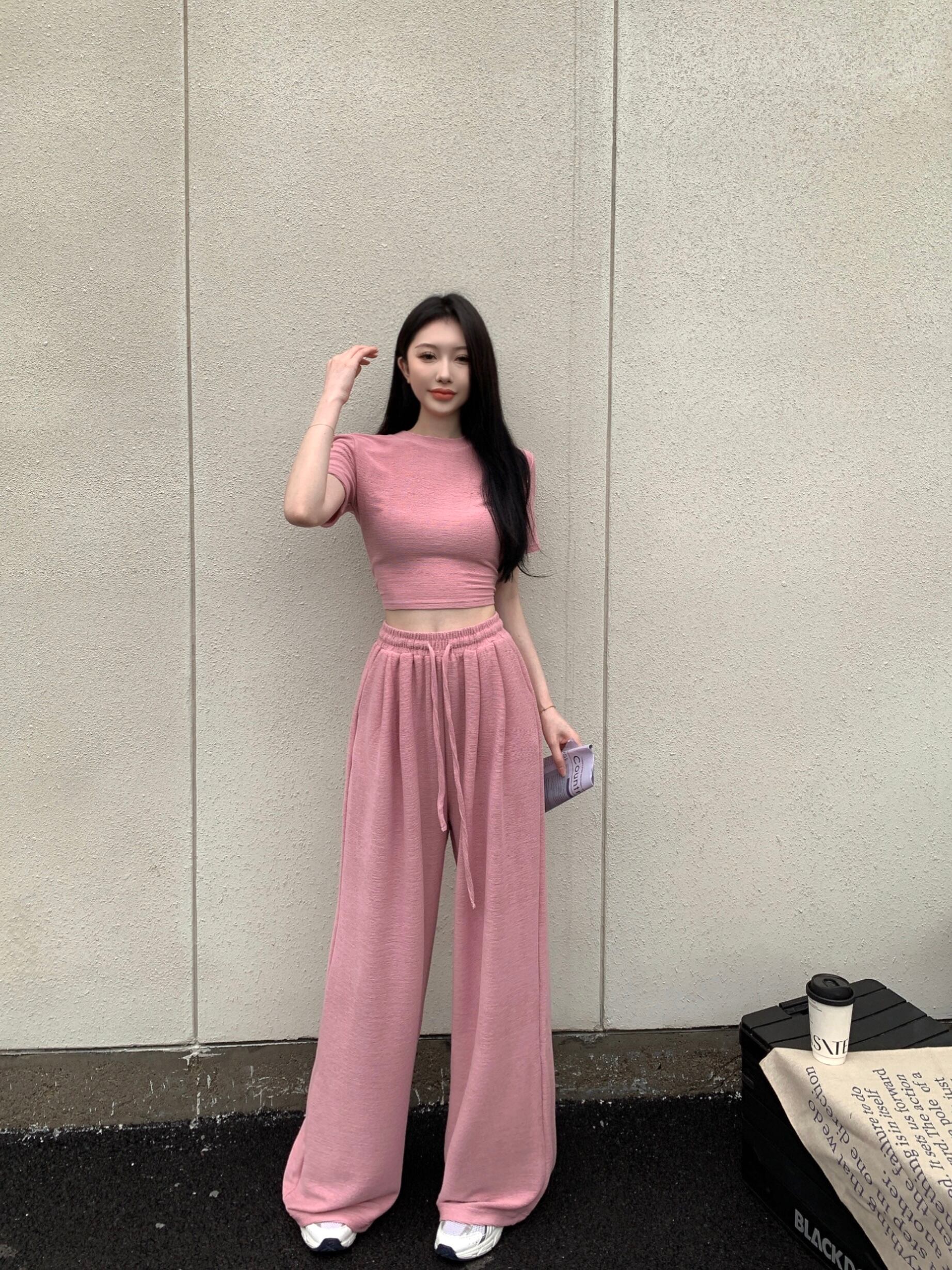 ホットガールスーツ夏バック中空レーススリムフィット半袖トップウエストルーズレッグパンツ 2 点セット服 ショート ハーフスリーブ サマー 夏物