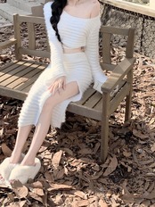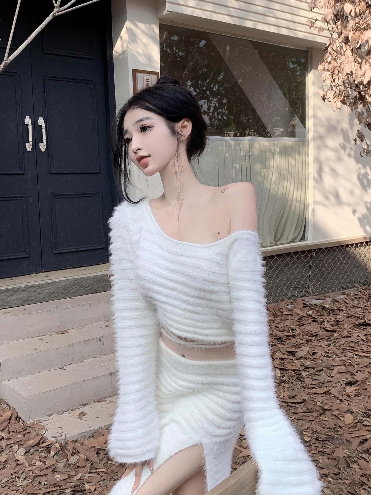 ツーピースセットレディース衣装ニット長袖トップ臀部ラップスカート無地梨花服秋/冬スカートセット ロング オータム 秋物 ウィンター 冬物 ソリッドカラー