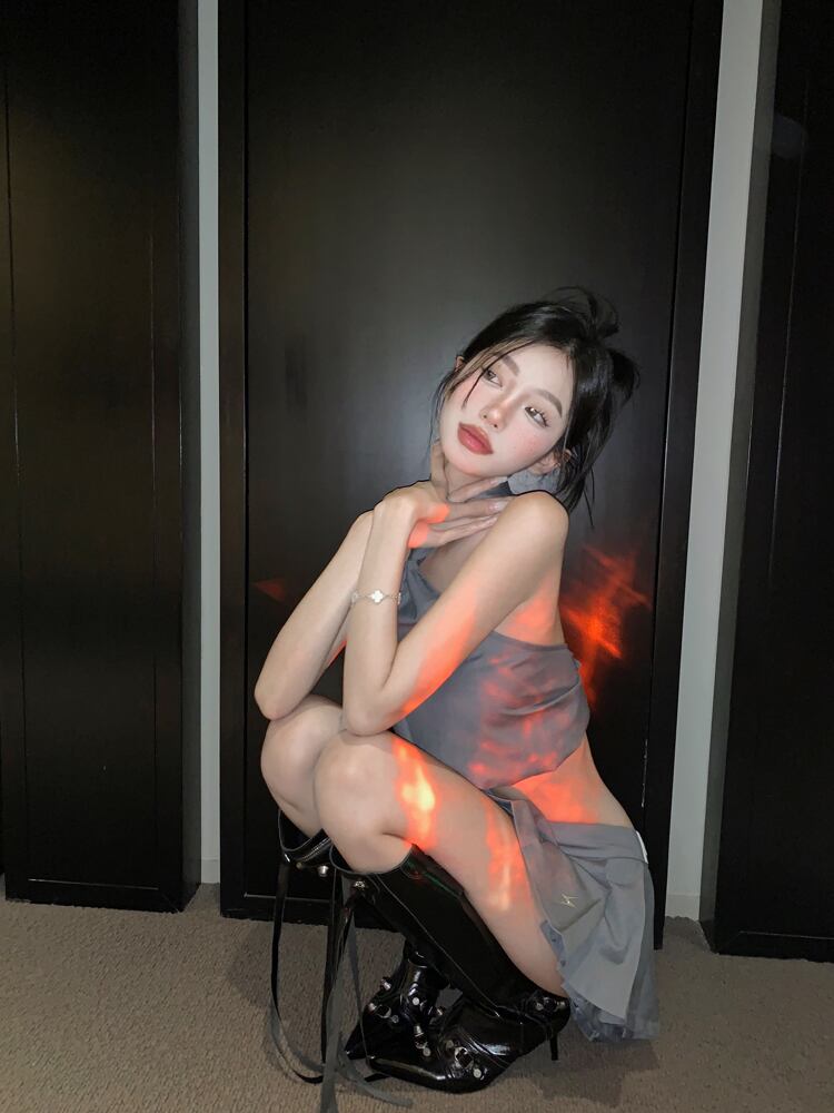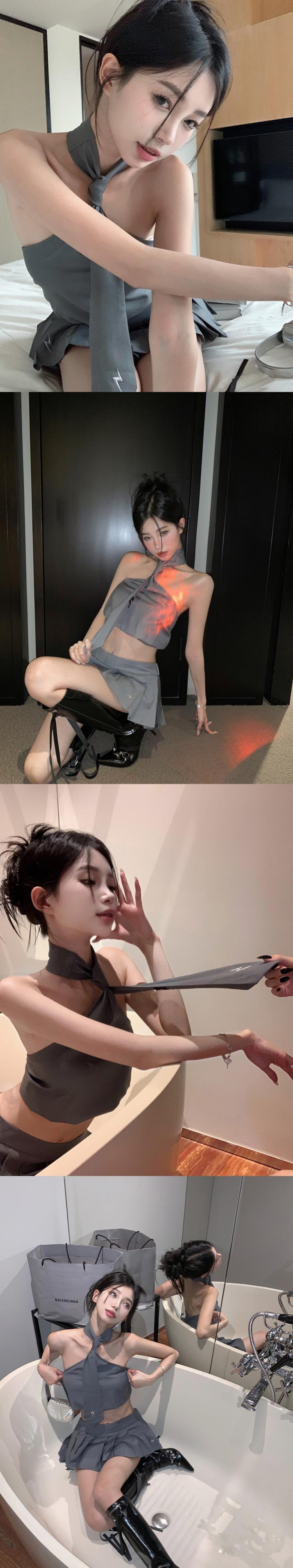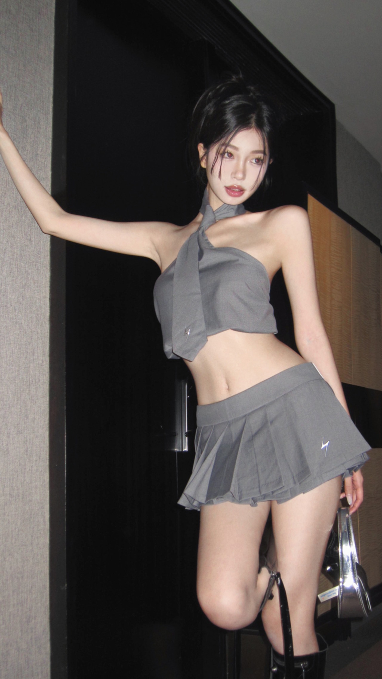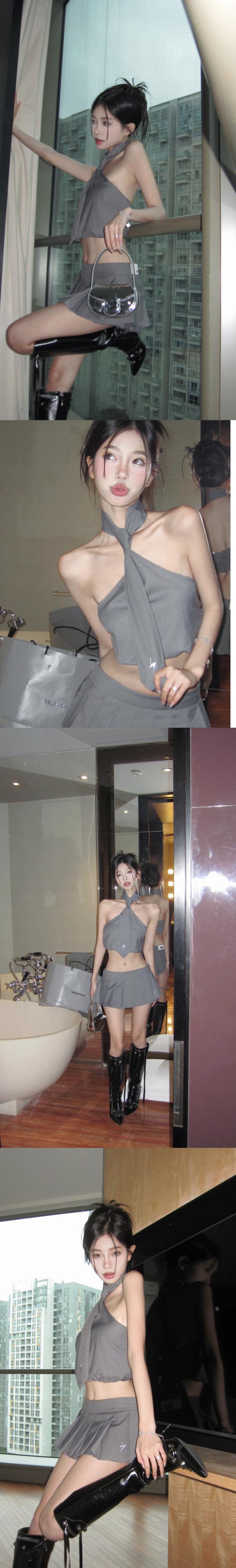 夏セクシーホットガールズスーツグレーホルターネックストラップタンクトップスカートプリーツミニスカートツーピースセット服 サマー 夏物