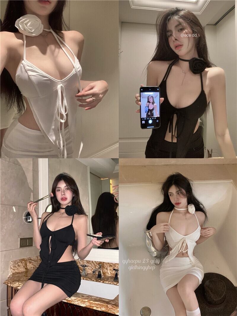 ホットガールスーツセクシー不規則ローカット V ネックホルターネックバックレスフラワーストラップトッププリーツラップヒップスカート 2 点セット Vネック フラワーデザイン