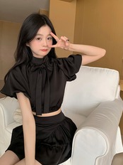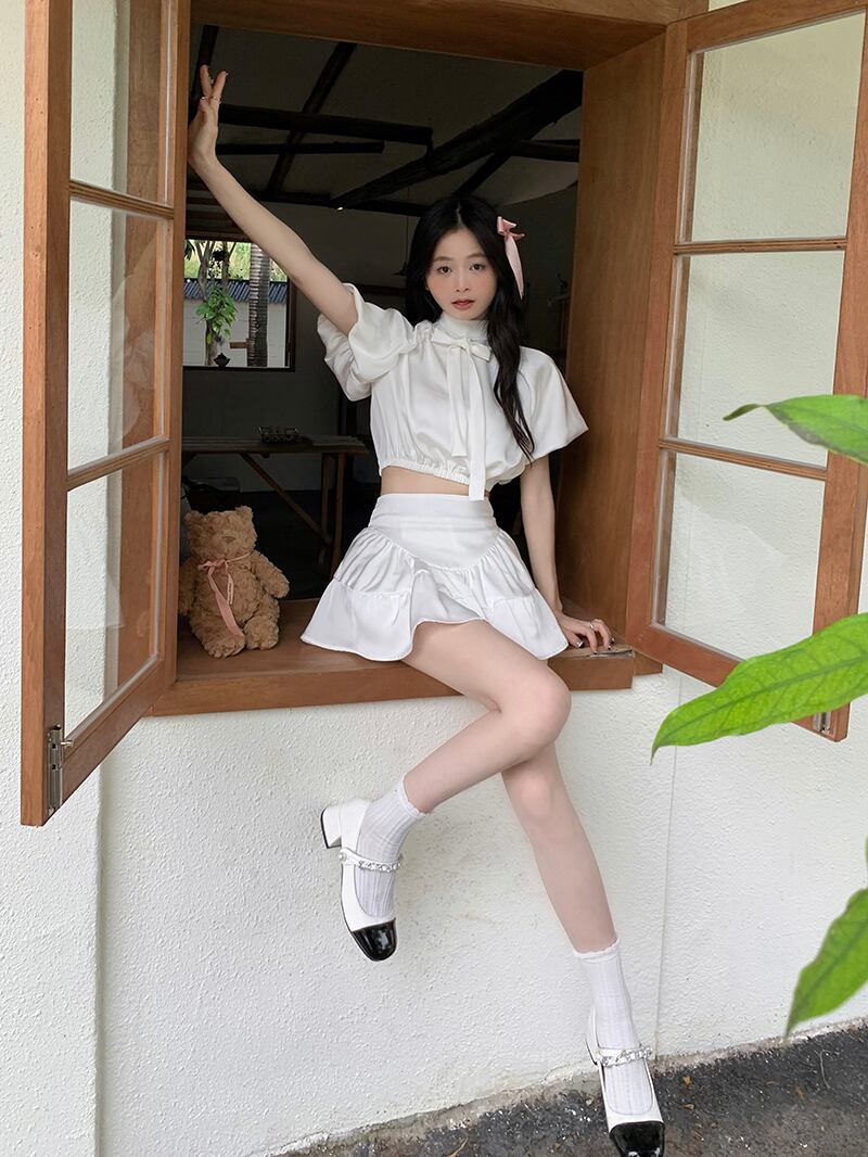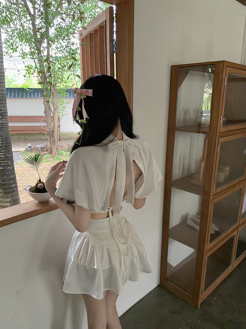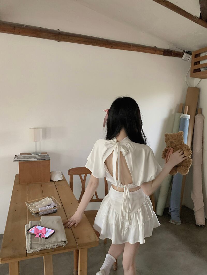 Sweet Girl セット レディース 半袖 シフォン レースアップ バックレス Tシャツ ホワイト トップス ウエスト Aライン プリーツスカート 2点セット ショート ハーフスリーブ 大人ガーリー スウィート キュート カジュアル