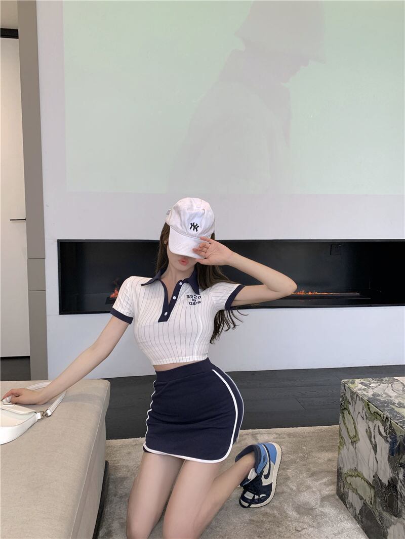 スポーツスーツ夏ターンダウン襟半袖ストライプトップホットガールラップヒップミニスカート 2 点セット サマー 夏物