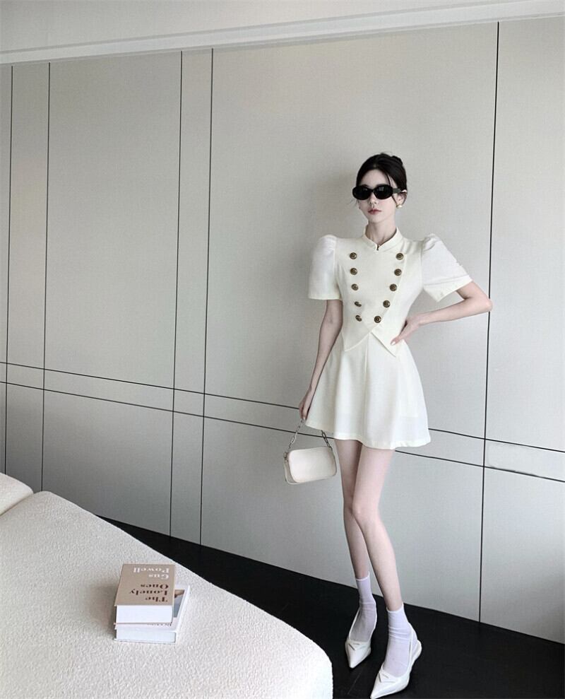 フレンチスタイル オフィスレディスーツ レディース バブルスリーブ スタンドカラー ダブルブレスト ショートコート ウエストスカート 2点セット 会社 学校 通勤や通学にも