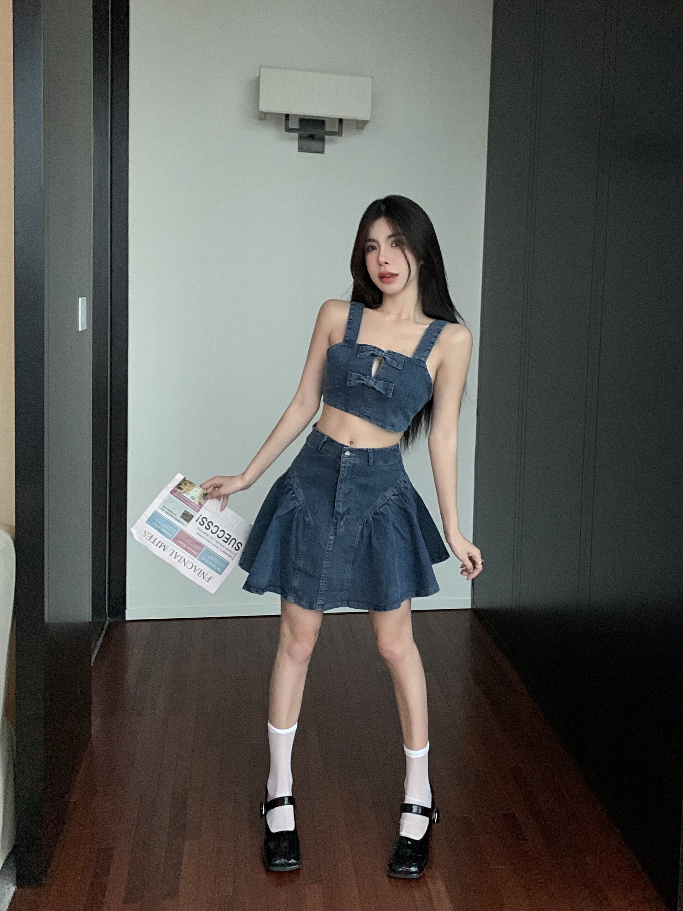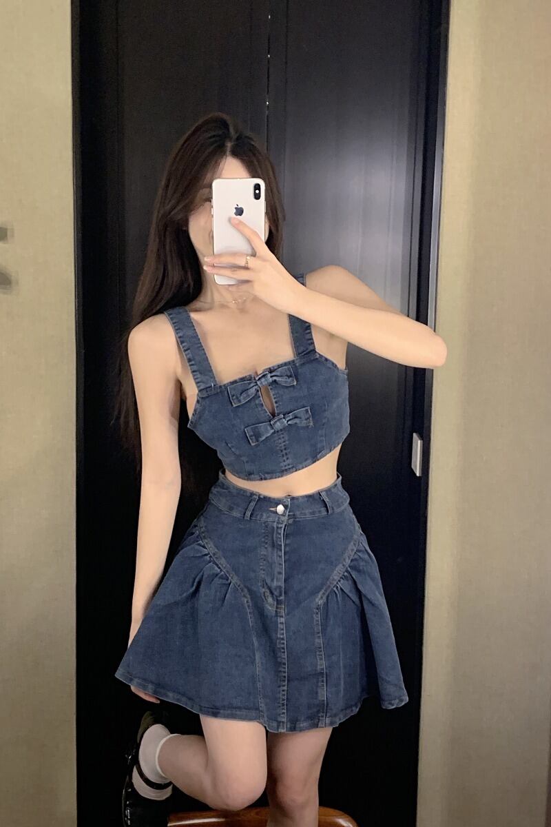 甘くてホット女子セクシースーツ夏デニムボウストラップタンクトップウエストミニスカートツーピースセット服 リボン 大人ガーリー スウィート キュート カジュアル サマー 夏物