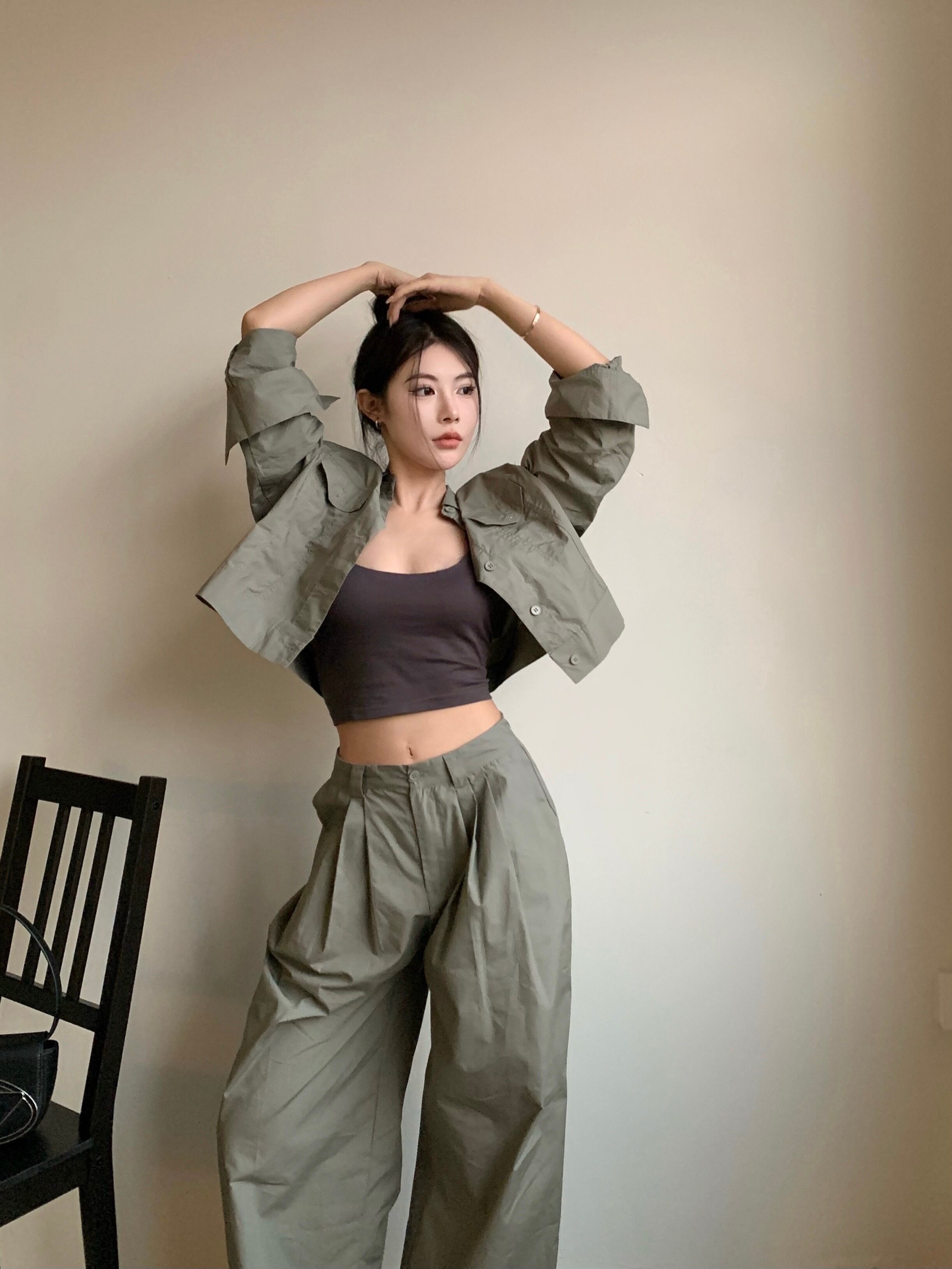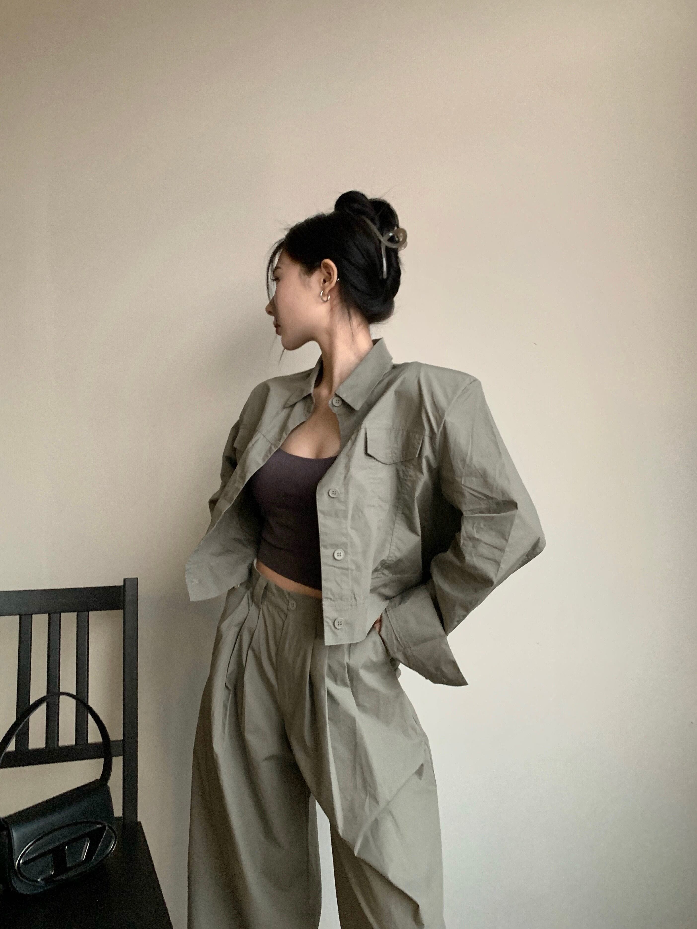 ホットガールスーツターンダウンカラー長袖シャツウエストワイドレッグパンツツーピースセット服 ロング ワイドパンツ