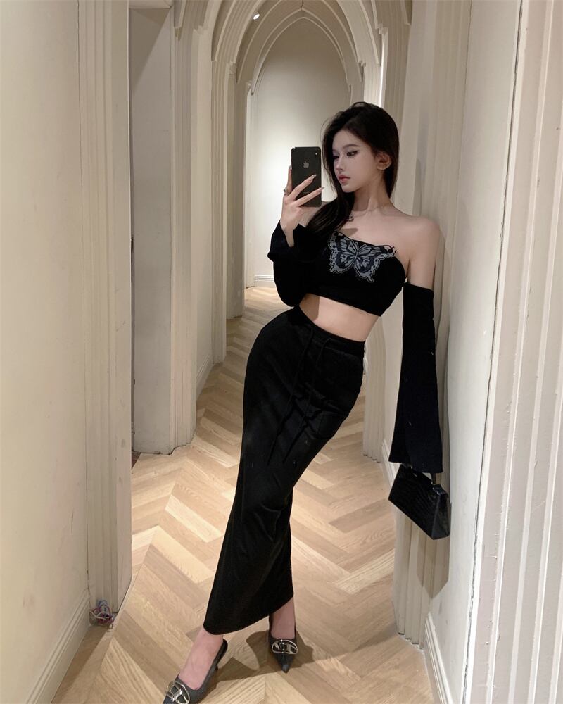 ホットガールスーツセクシー蝶オフショルダー長袖 Tシャツトップ夏ウエストラップヒップロングスカート 2 点セット サマー 夏物