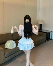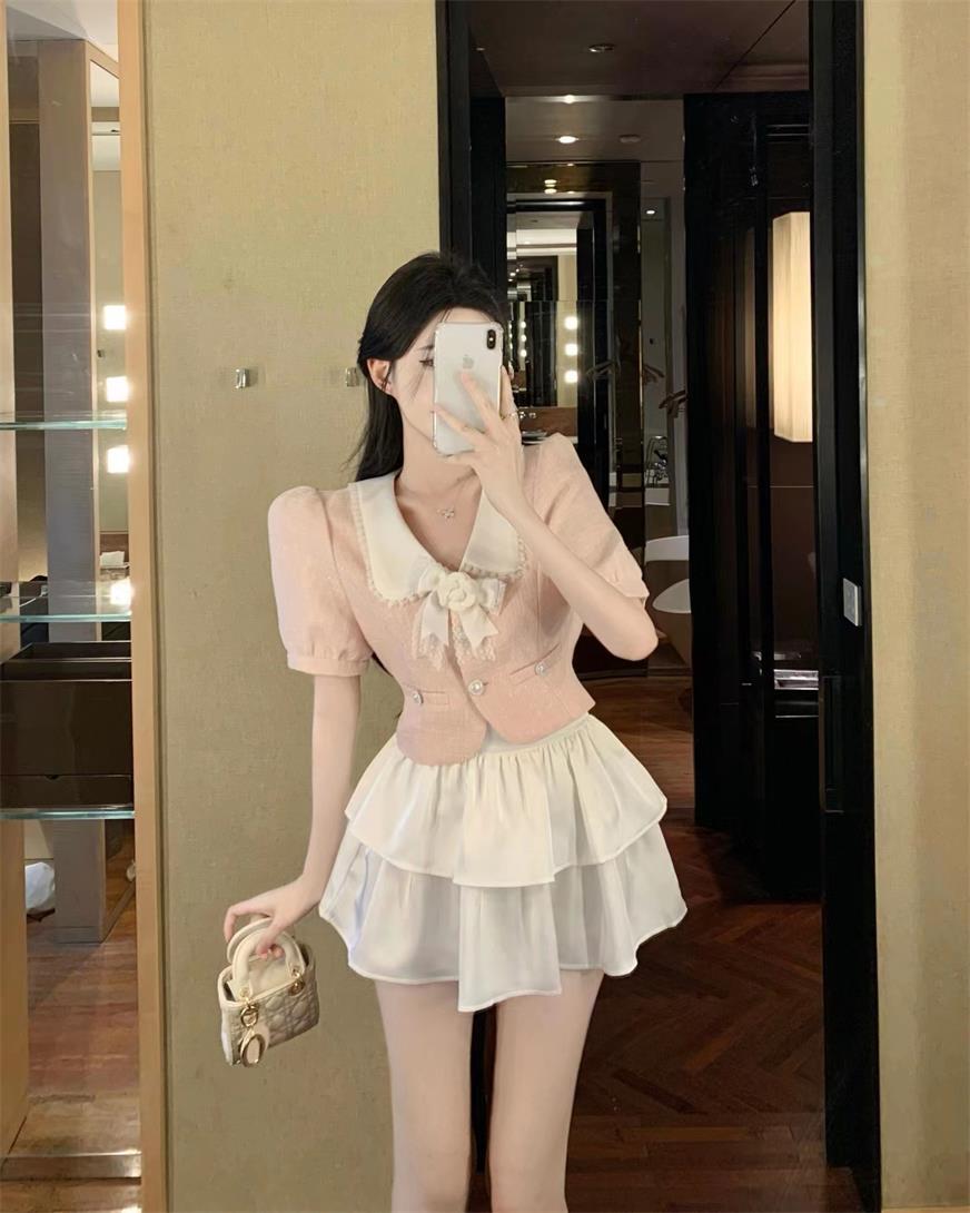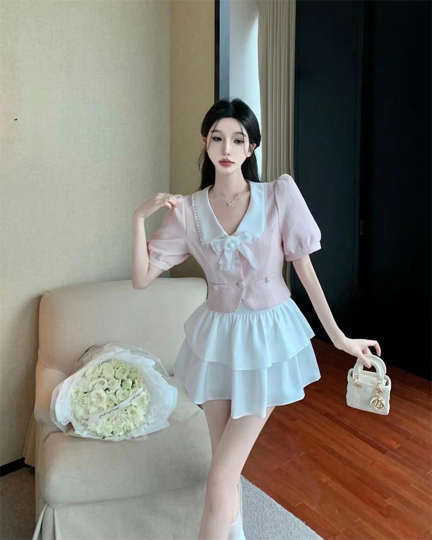 スイートガールズスーツ レディース ピン フラワーコントラスト ターンダウンカラー 半袖 トップ ウエスト ふわふわ スカート 2点セット ショート ハーフスリーブ 大人ガーリー スウィート キュート カジュアル フラワーデザイン