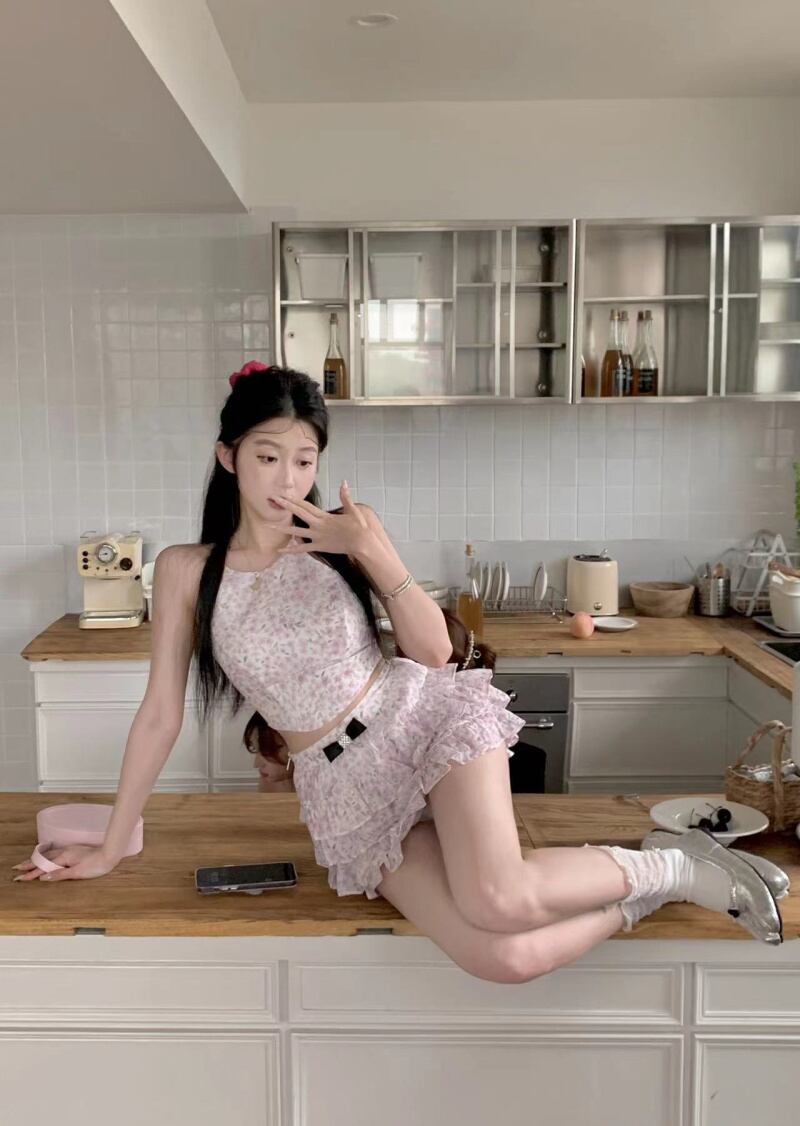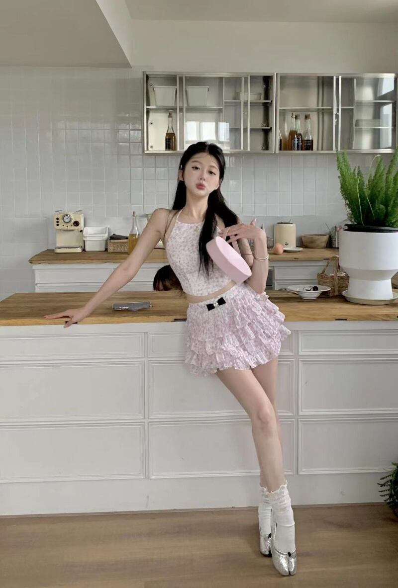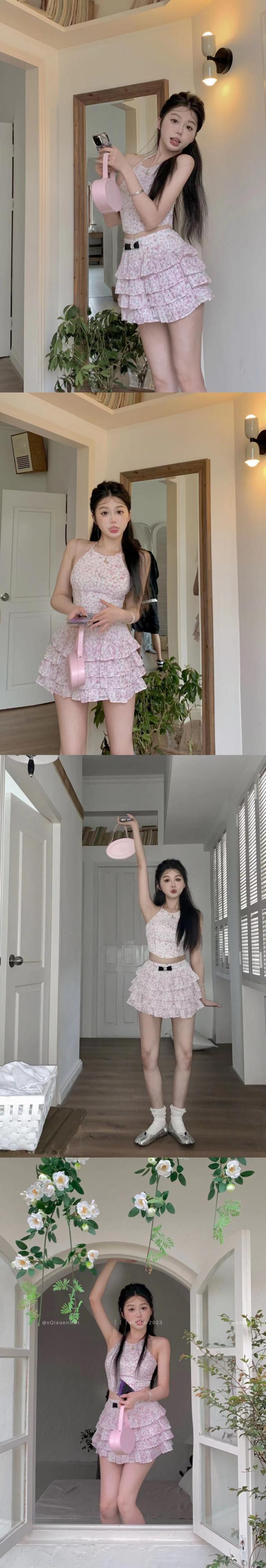 ホットガール花柄スーツ夏ホルターネックストラップタンクトップウエスト A ラインミニスカート 2 点セット服 サマー 夏物 Aライン