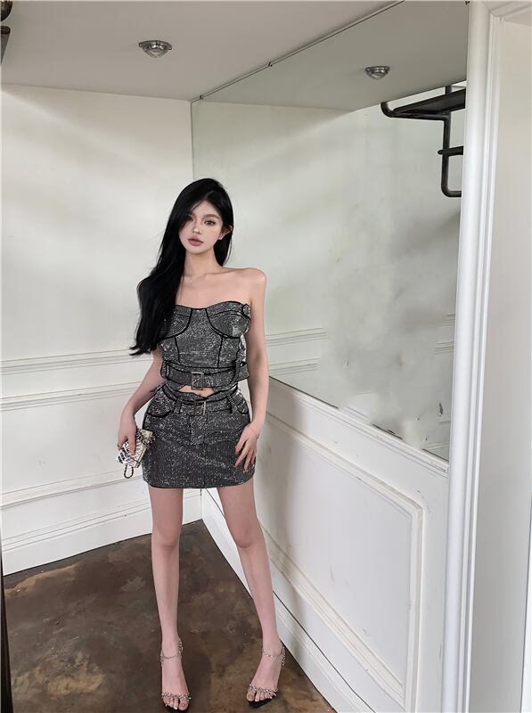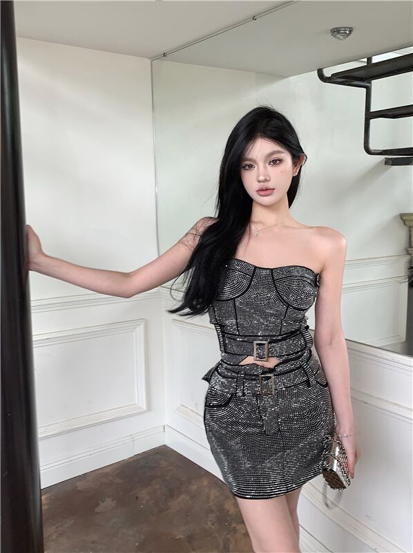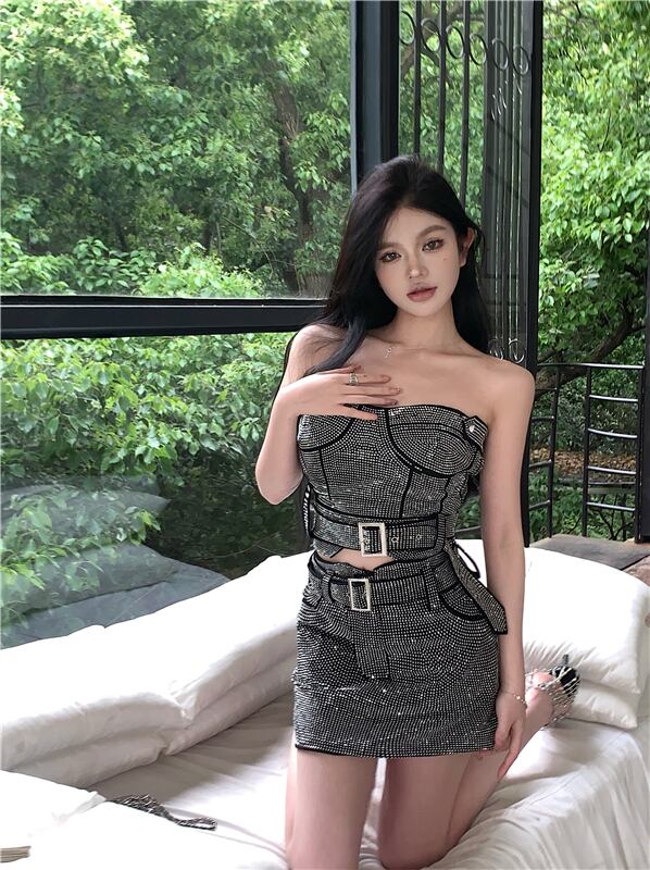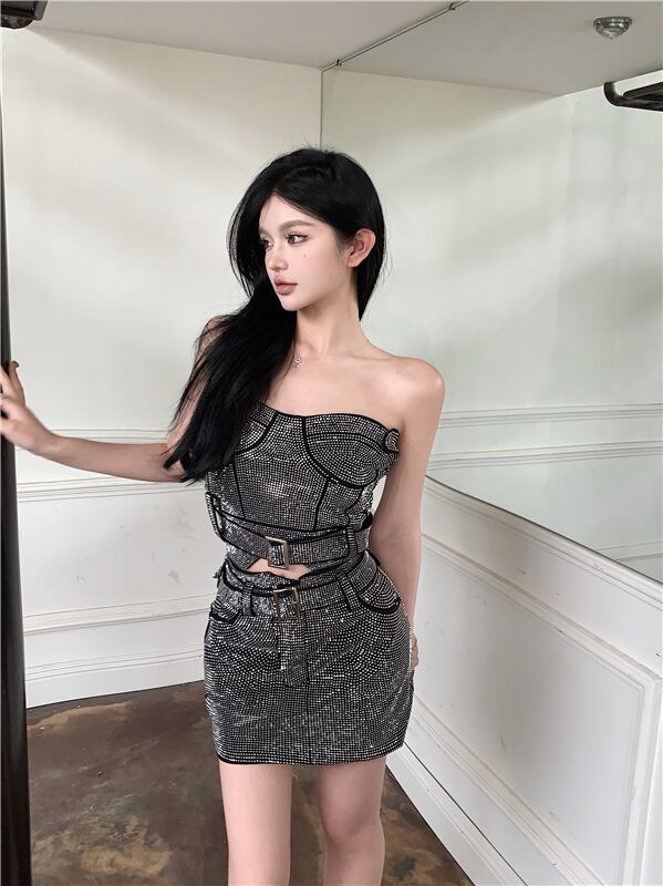 ホットガールズセクシースーツホットダイヤモンドストラップレストップスパンコールダイヤモンドスリムフィットラップヒップミニスカートツーピースセット服