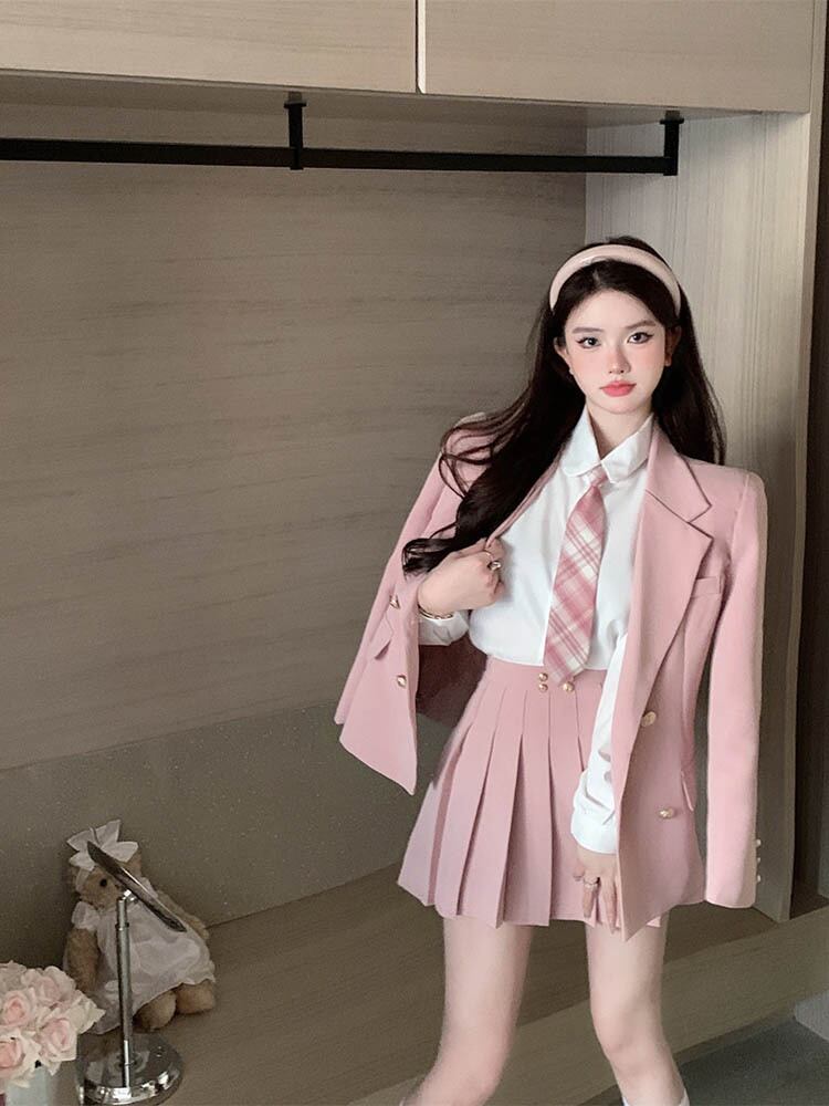 3 点セットレディース衣装甘いジャケットシャツウエストプリーツスカートレディース服秋/冬スカートセット 大人ガーリー スウィート キュート カジュアル オータム 秋物 ウィンター 冬物 ソリッドカラー