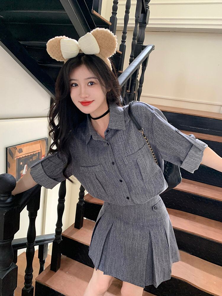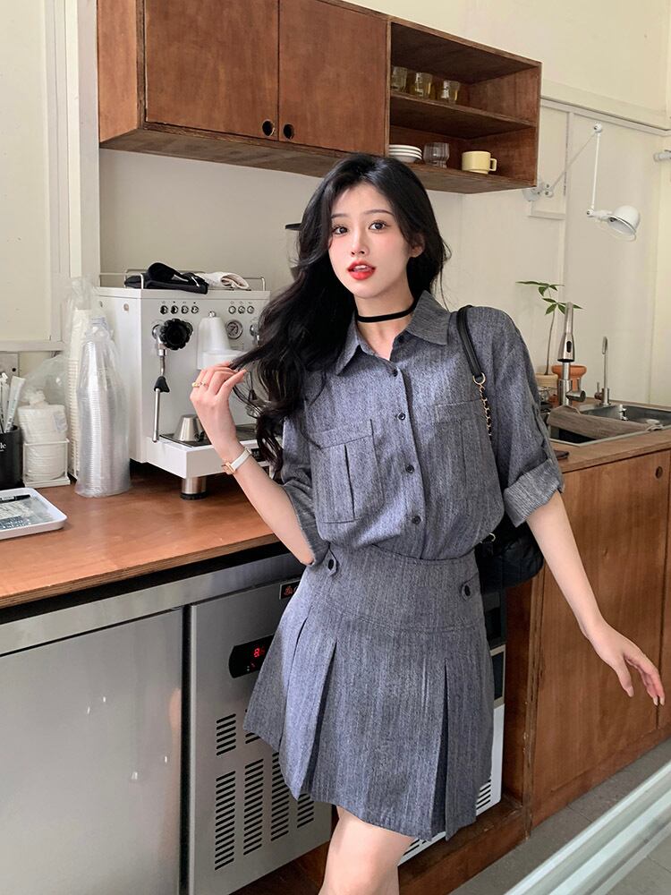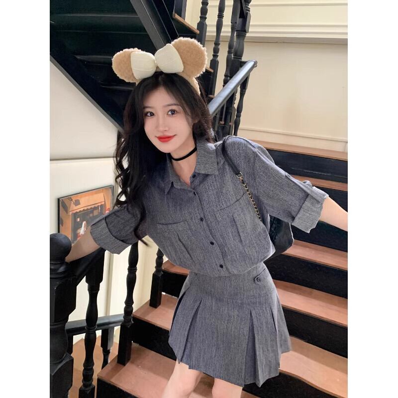 ホットガールレトログレースーツ夏デニムシャツトップウエストプリーツミニスカートツーピースセット服 サマー 夏物