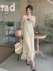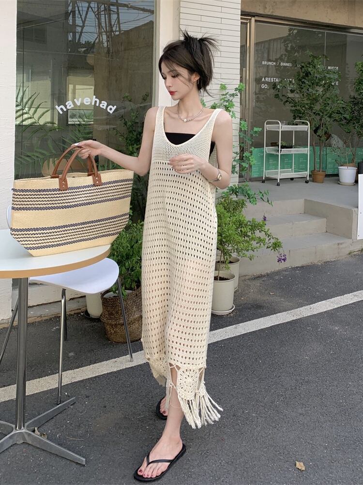 Gothiscyn 夏シック中空ベスト ニット ドレス フレンチ スタイル ルーズ レイヤード ミディ ドレス レディース レッド サマー 夏物