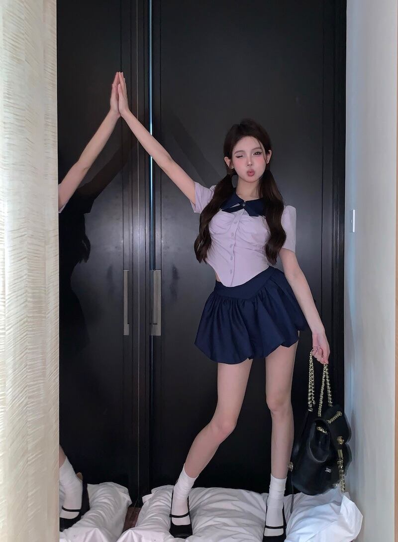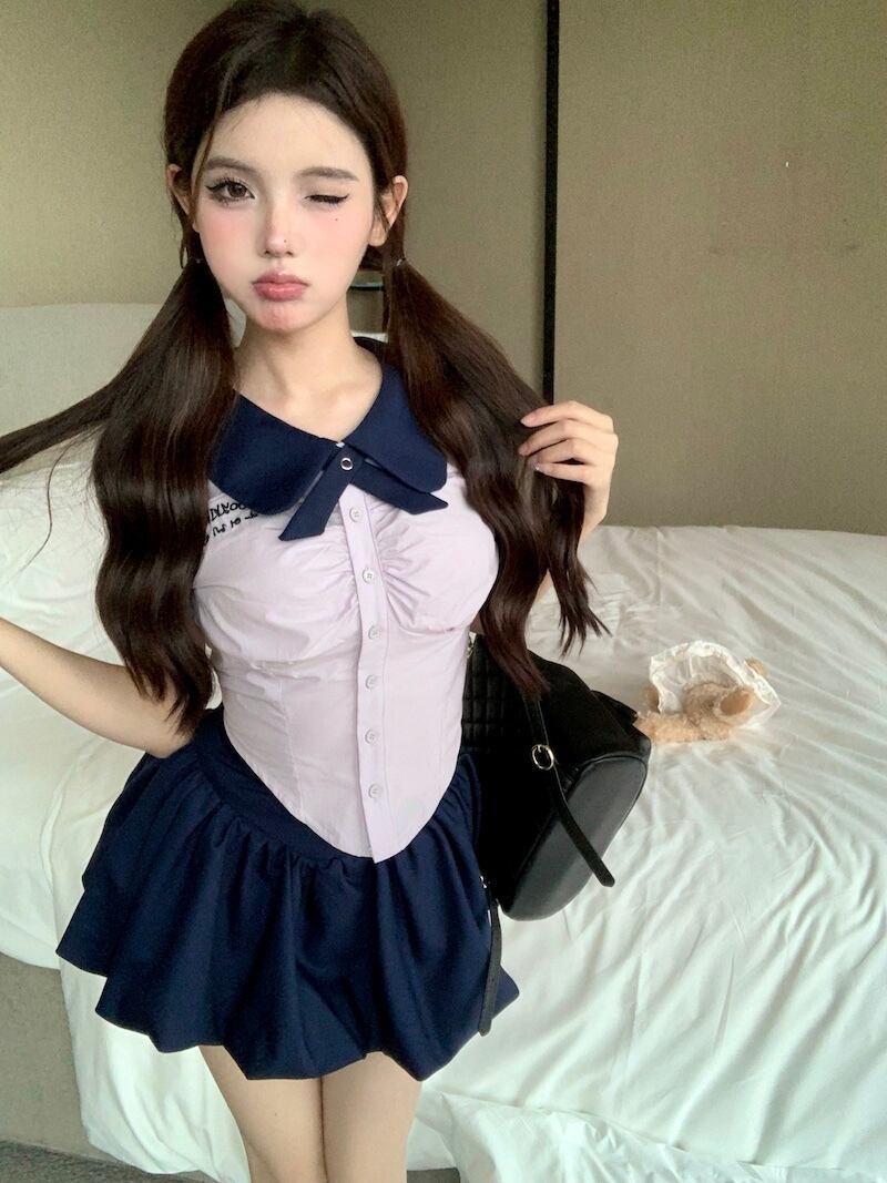 プレッピースタイルスーツ レディース スリムフィット 半袖 JK シャツ ウエストふわふわ ミニスカート 2点セット 服