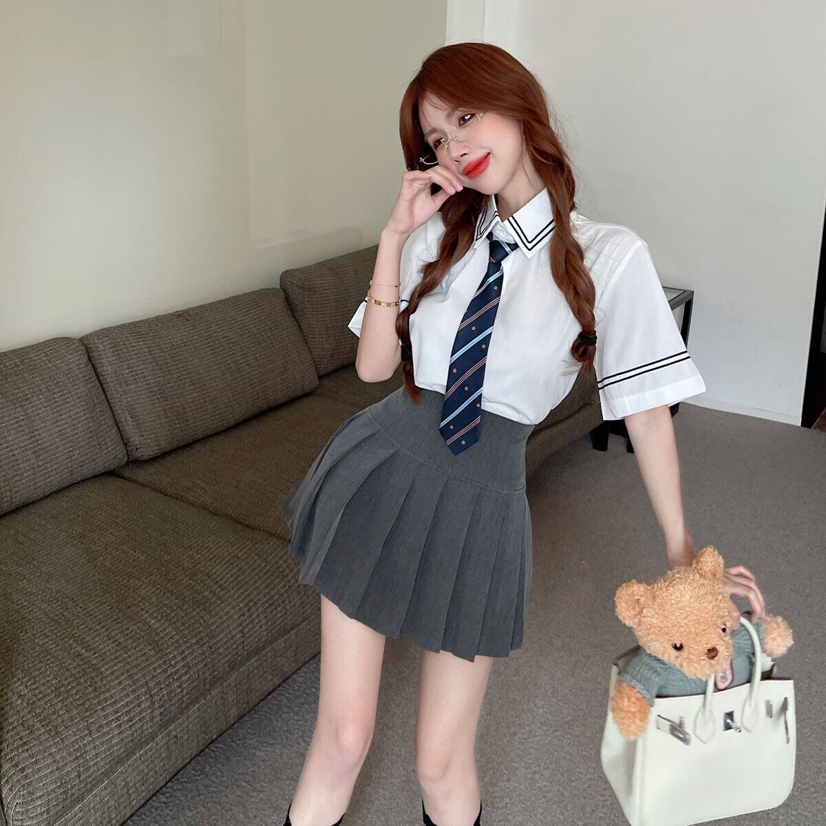 スタイルスウィートガールスーツ半袖 JK シャツスリムトップウエストプリーツスカート 2 点セット服 ショート ハーフスリーブ 大人ガーリー キュート カジュアル