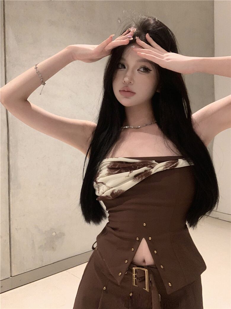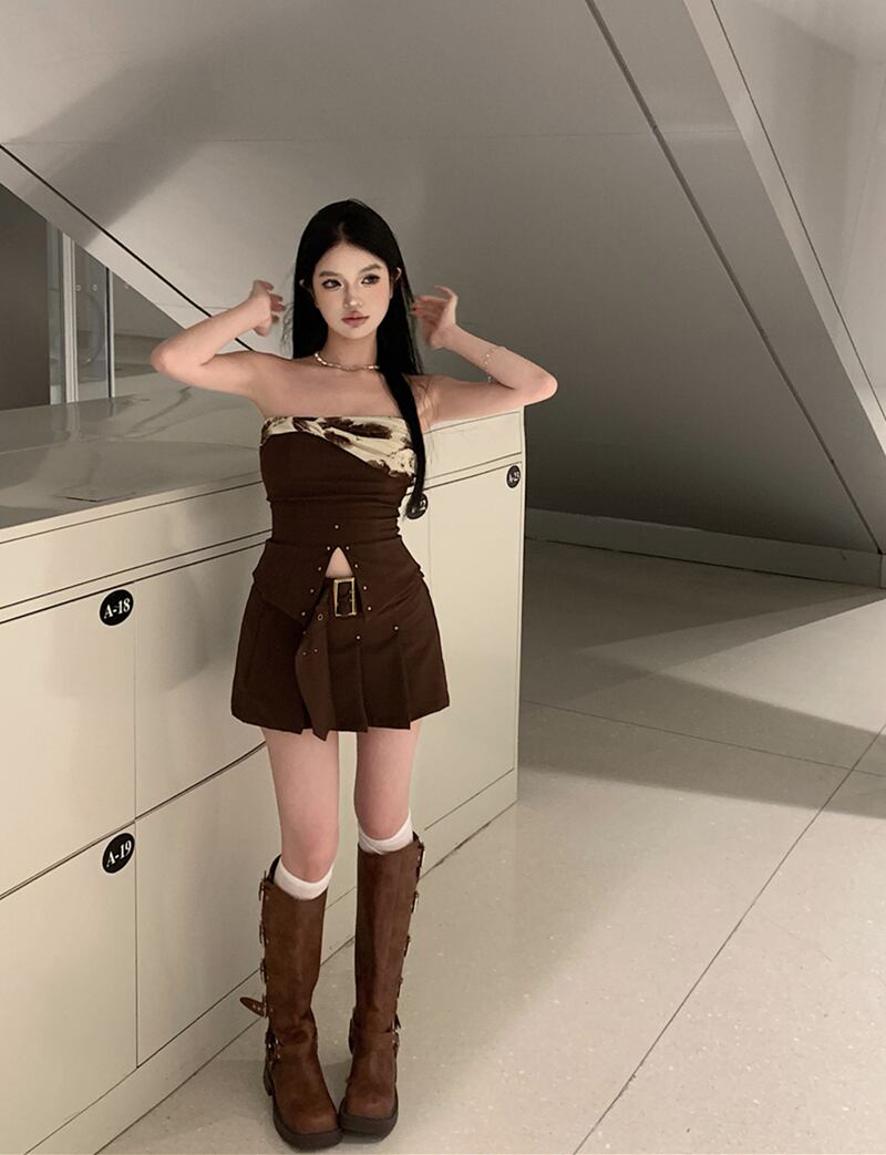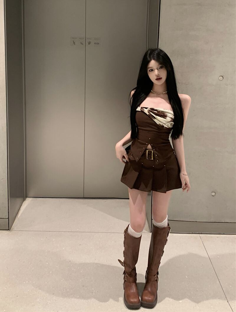 アメリカレトロホットガールズスーツ夏スプライスストラップレストッププリーツミニスカート 2 点セット服 サマー 夏物