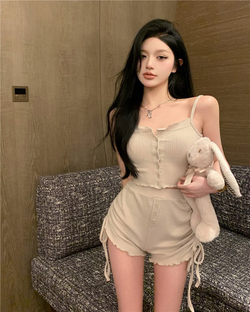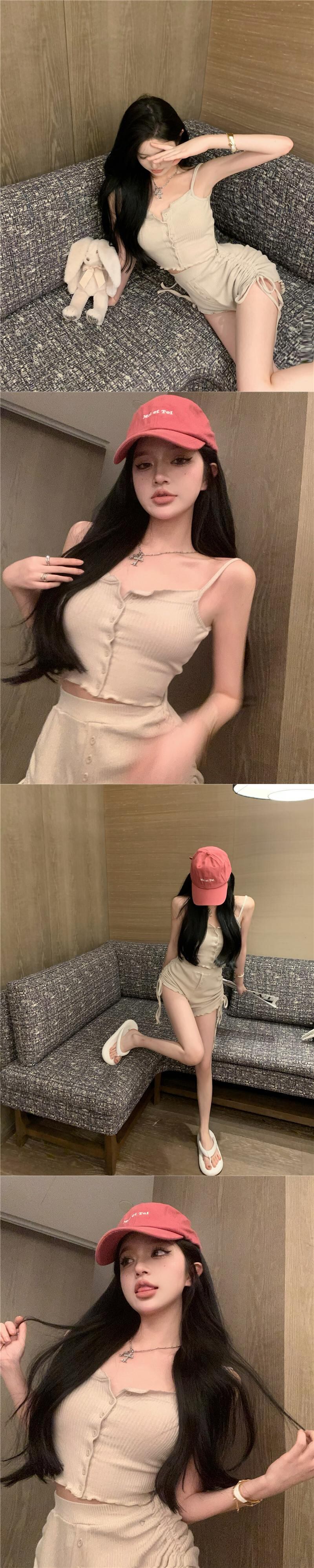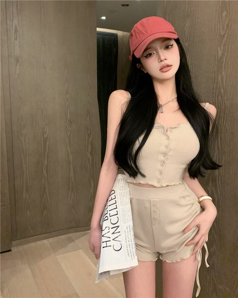 ホットガールサマースーツブルーピュアセクシーサスペンダーベストトップウエストショーツ 2 点セット服 夏物 ブルマー