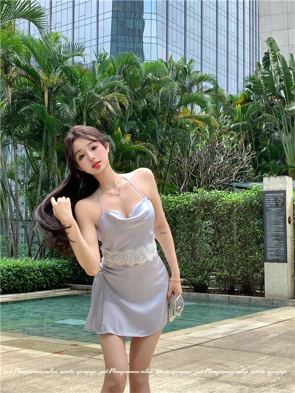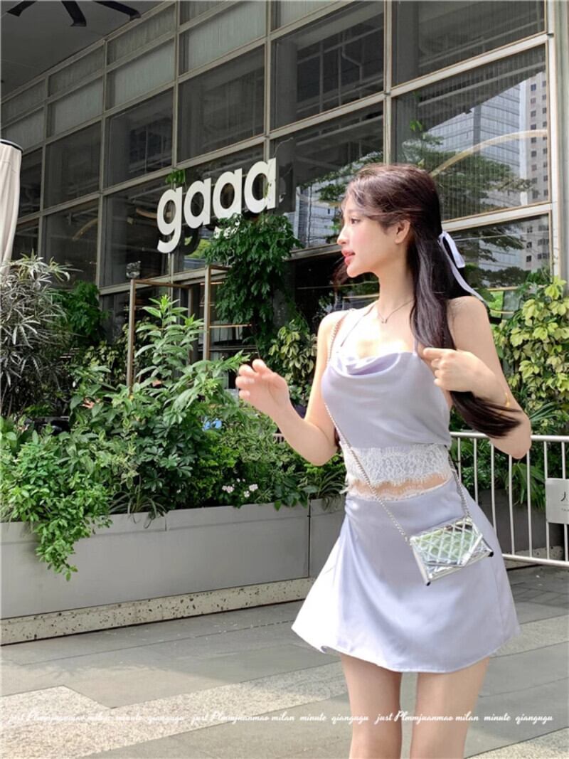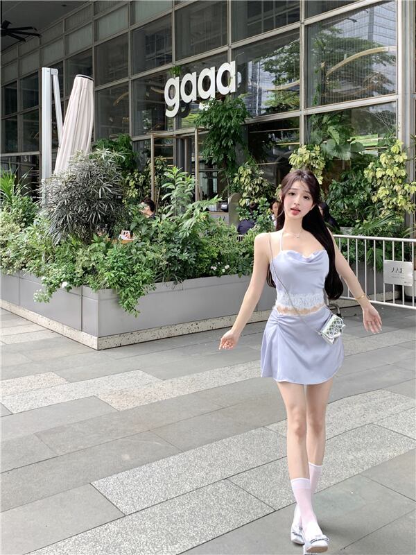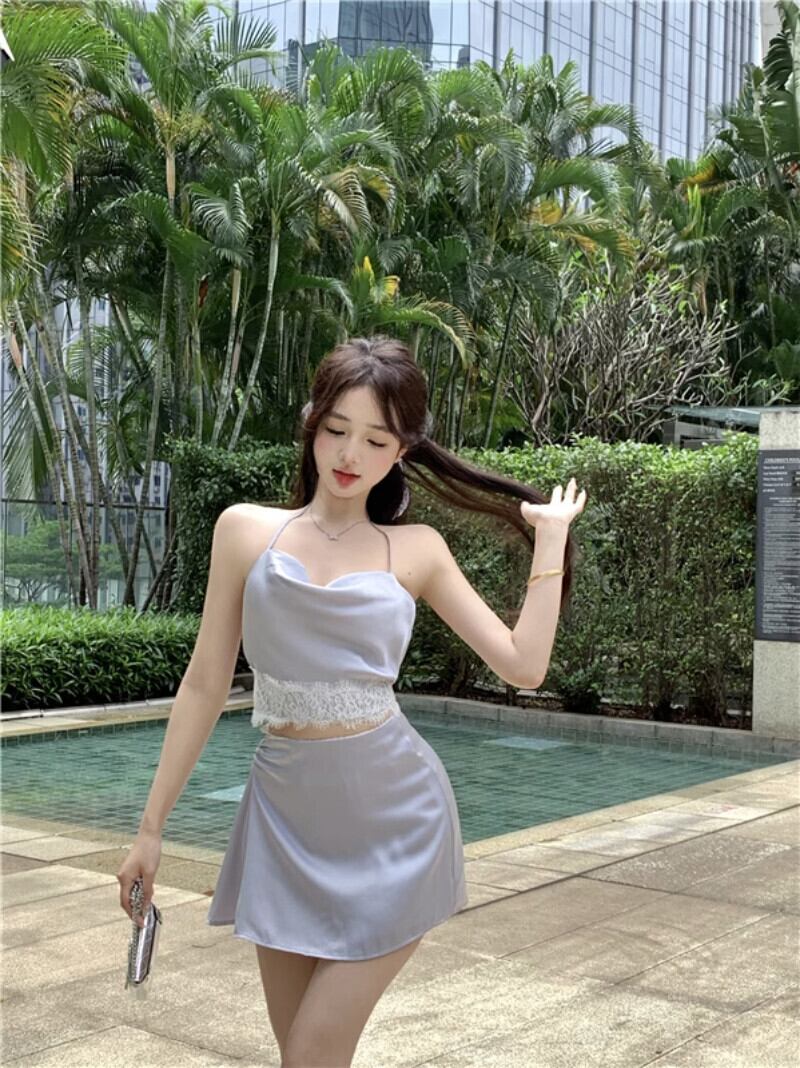 甘くてホットガールスーツセクシーレーススプライスホルターネックストラップタンクトップ夏ミニスカート 2 点セット服 大人ガーリー スウィート キュート カジュアル サマー 夏物