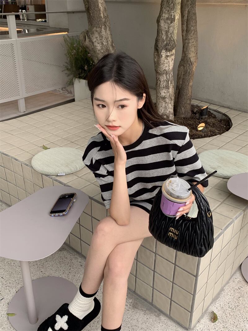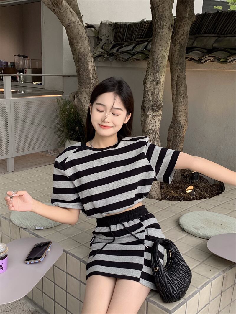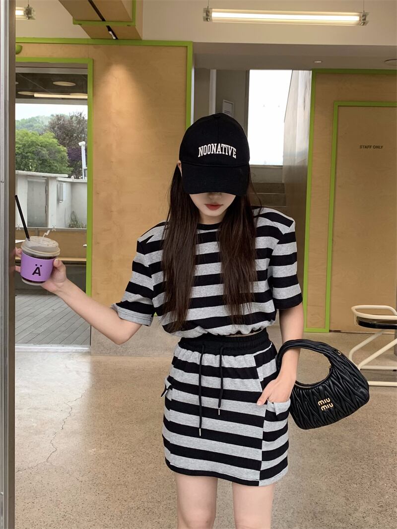 ホットガールスーツ夏レースアップ半袖ストライプ Tシャツ巾着ミニスカート 2 点セット服 サマー 夏物