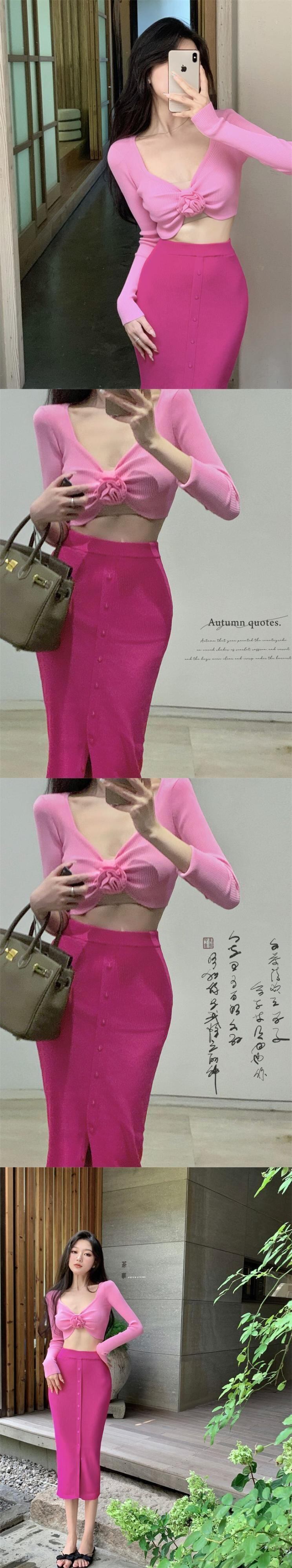 純粋セクシースタイルニットスーツ秋甘いホットガールフラワーショートトップウエストスリムフィットラップヒップスカート 2 点セット 大人ガーリー スウィート キュート カジュアル オータム 秋物 フラワーデザイン