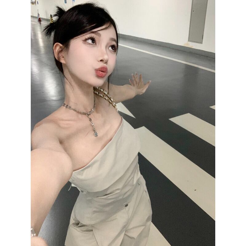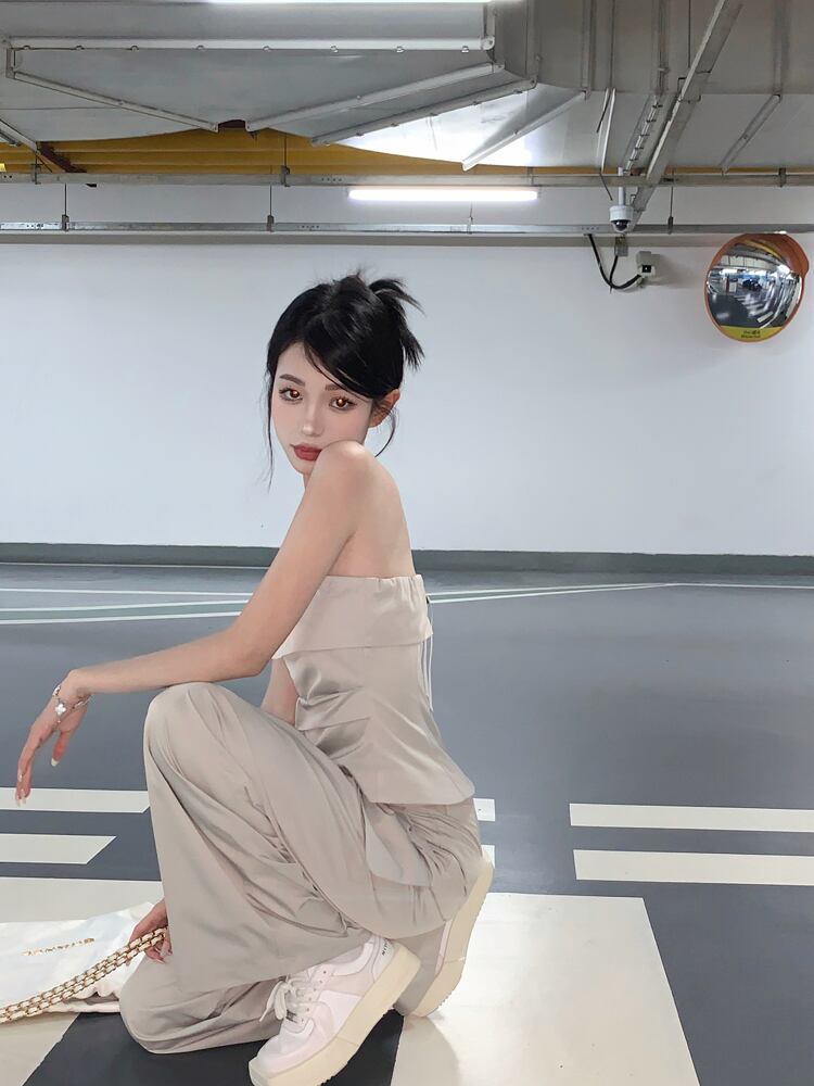 甘くてホット女子スタイルスーツプリーツ ストラップレス ノースリーブ トップ無地ルーズ パンツ 2 点セット服 大人ガーリー スウィート キュート カジュアル ソリッドカラー