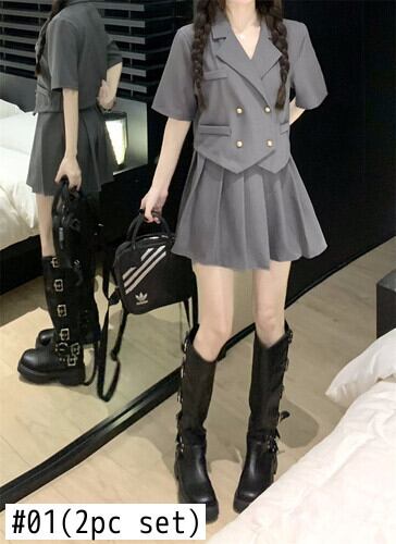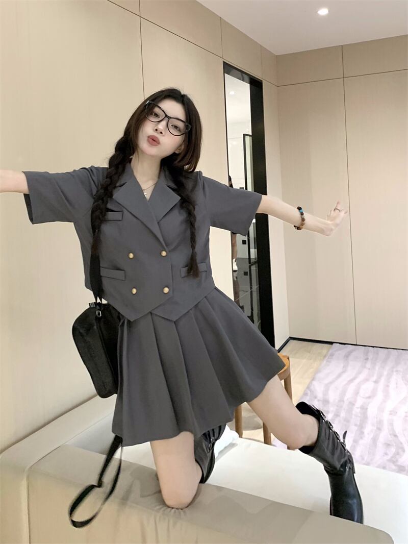 グレー アカデミー スタイル スーツ レディース 夏半袖コート トップ ウエスト スカート 2 点セット服 サマー 夏物